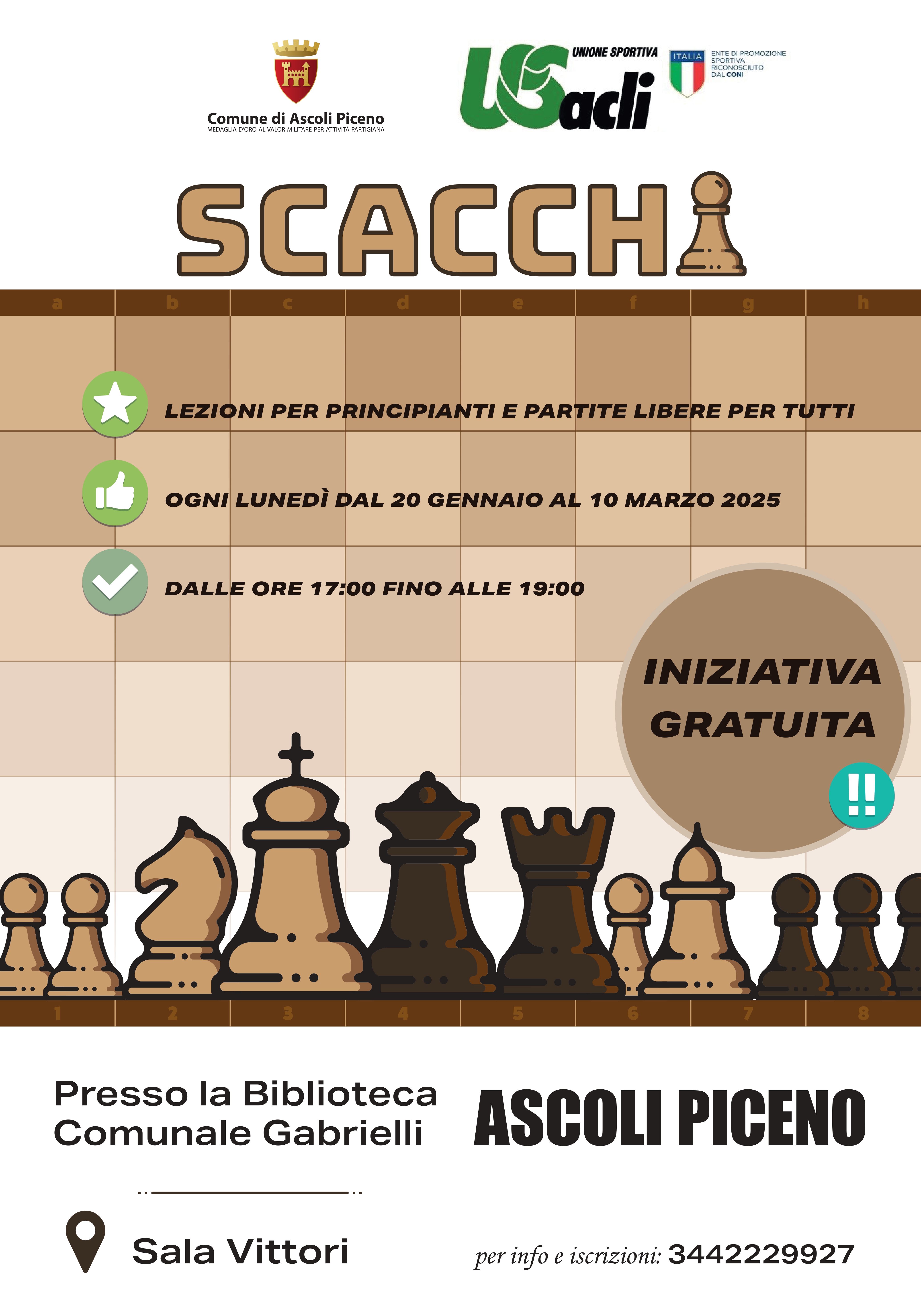 Sono ancora aperte le iscrizioni al corso gratuito di scacchi promosso dall’Assessorato alla pubblica istruzione del Comune di Ascoli Piceno e realizzato da Unione Sportiva Acli Marche Aps.
