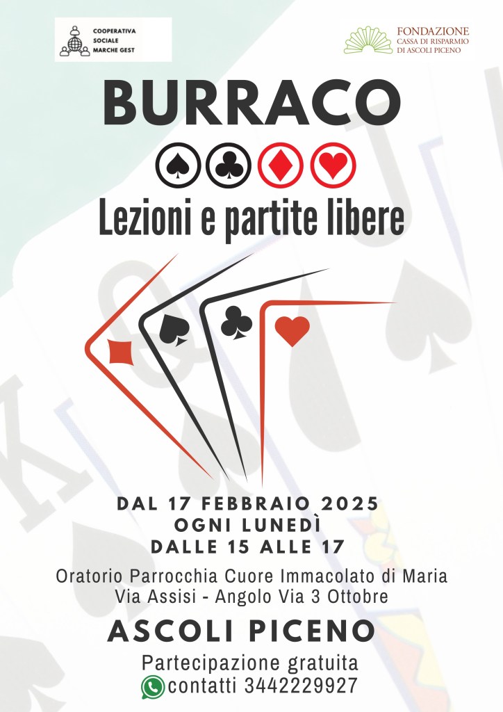 Dal 17 febbraio appuntamento con lezioni e partite libere di burraco presso l’oratorio della parrocchia del Cuore Immacolato di Maria in via Assisi angolo via 3 Ottobre ad Ascoli Piceno.
