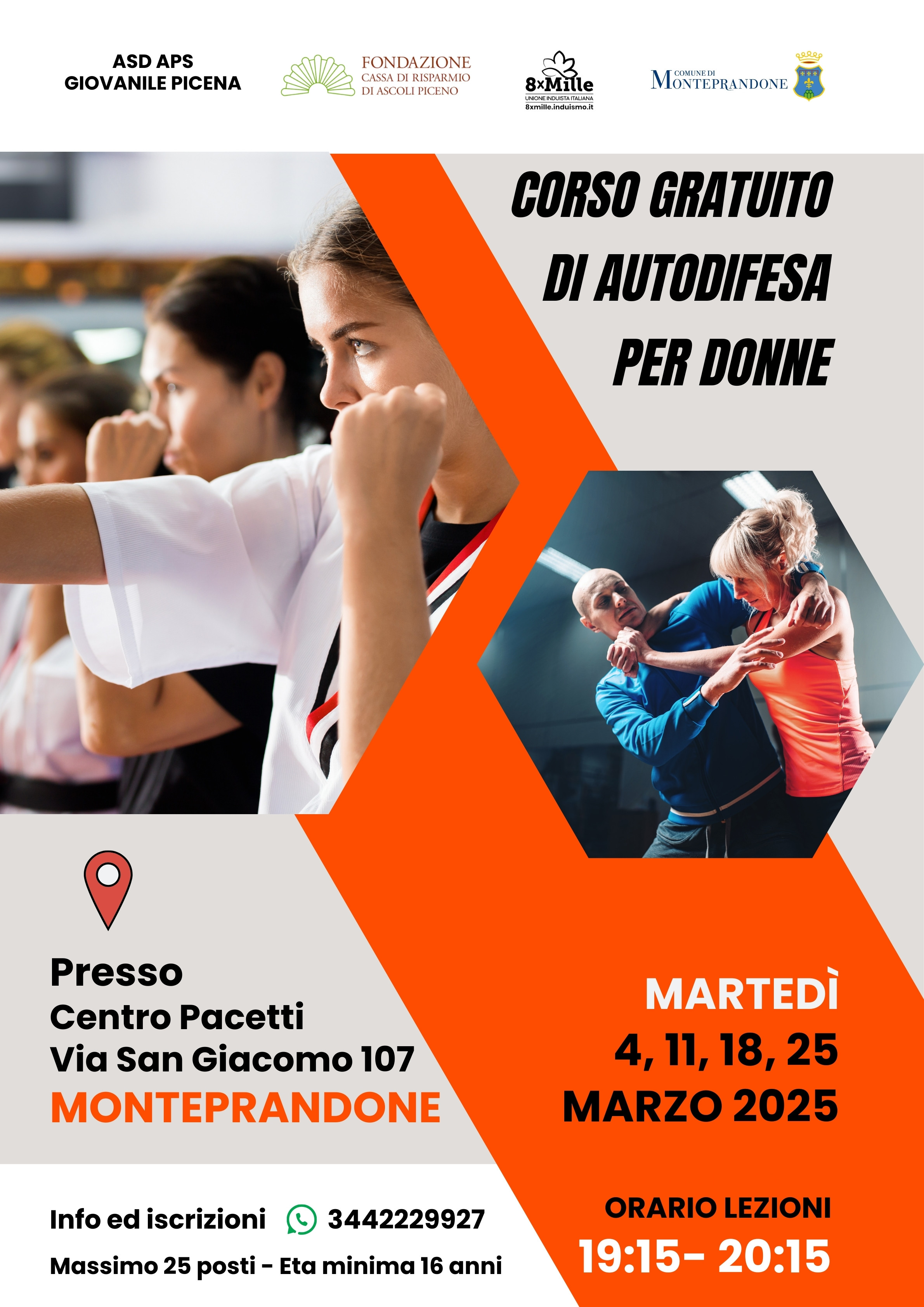 Dal 4 al 25 marzo, presso il Centro Pacetti in via San Giacomo 107 a Monteprandone, si svolgerà ogni martedì dalle 19,15 alle 20,15, un corso gratuito di autodifesa per donne.