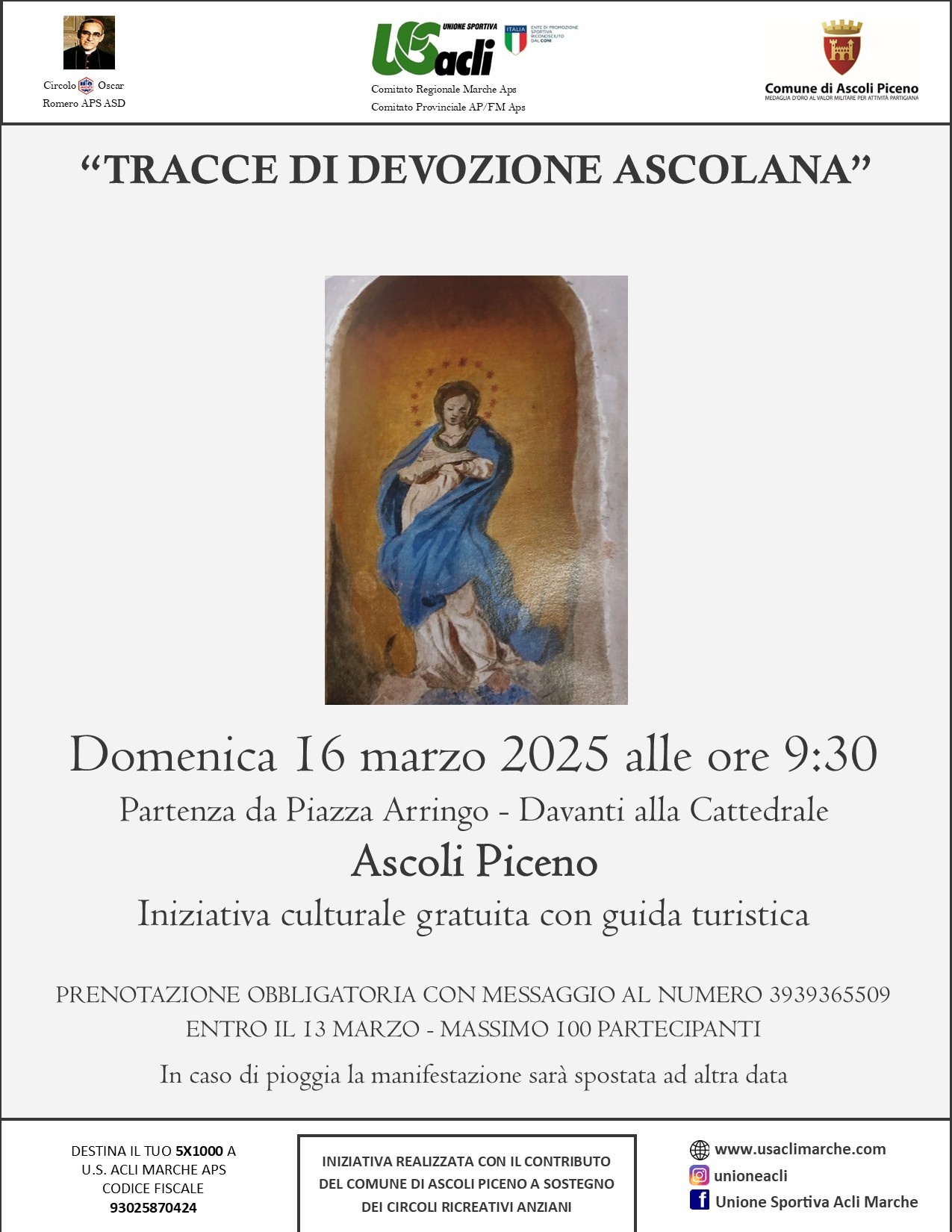 L’iniziativa prevede l’attraversamento di un percorso cittadino della durata di 2 ore circa, con una guida turistica abilitata, dedicato a conoscere meglio i tanti segni di devozione religiosa presenti nella città di Ascoli Piceno.
