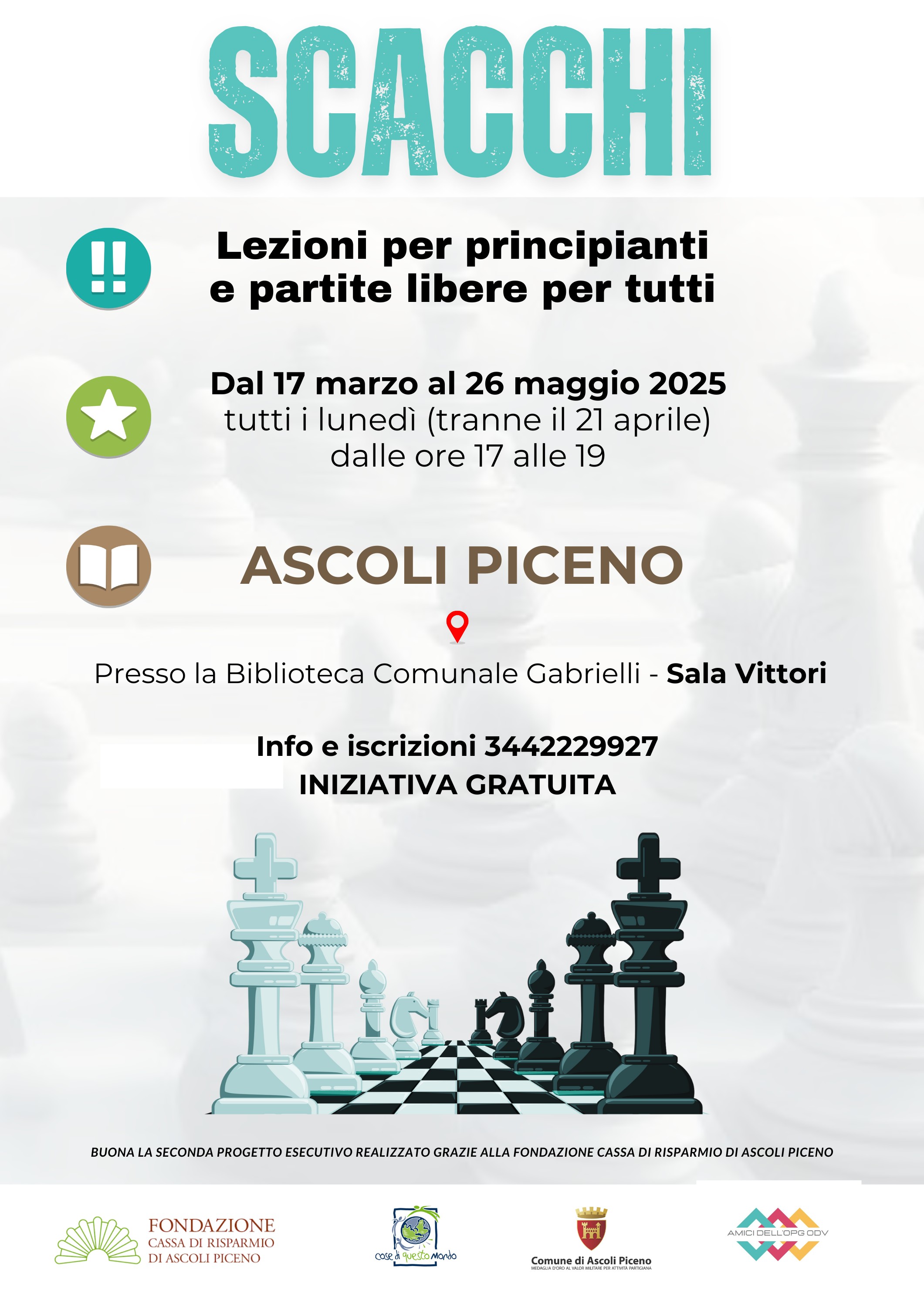 Ogni lunedì, dal 17 marzo al 26 maggio, presso la Sala Vittori della Biblioteca Comunale di Ascoli Piceno, dalle 17 alle 19, sono in programma lezioni e partite libere di scacchi per persone di ogni età.