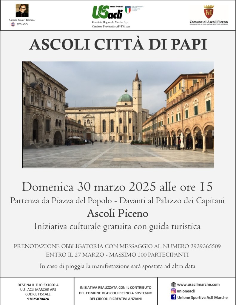 Domenica 30 marzo si svolgerà il tour culturale “Ascoli città di Papi” con partenza alle 15 davanti al Palazzo dei capitani in Piazza del Popolo ad Ascoli Piceno.