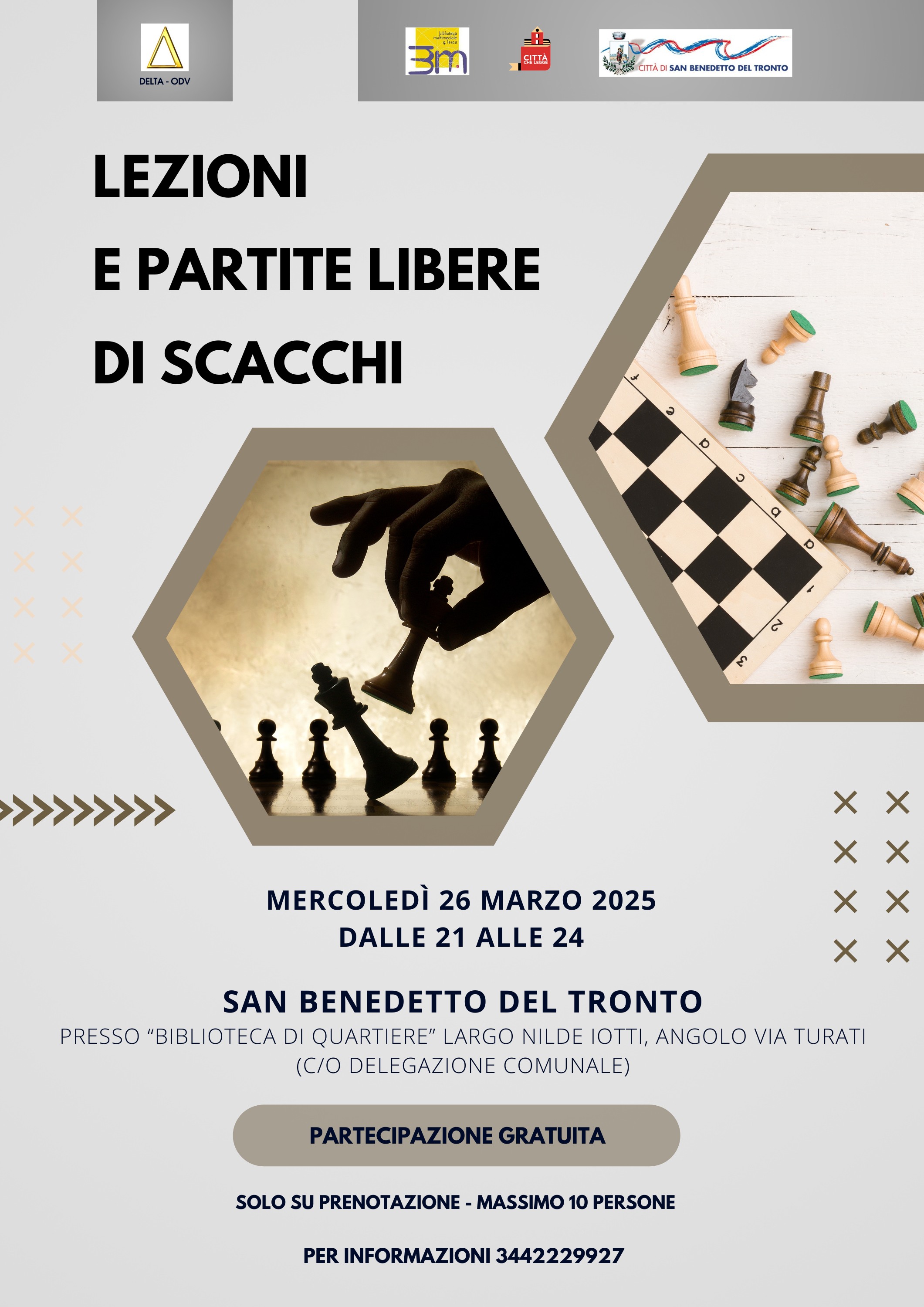 Per poter seguire le lezioni o effettuare partite libere di scacchi occorre prenotare al numero 3442229927 perché è previsto un tetto massimo di 10 partecipanti.