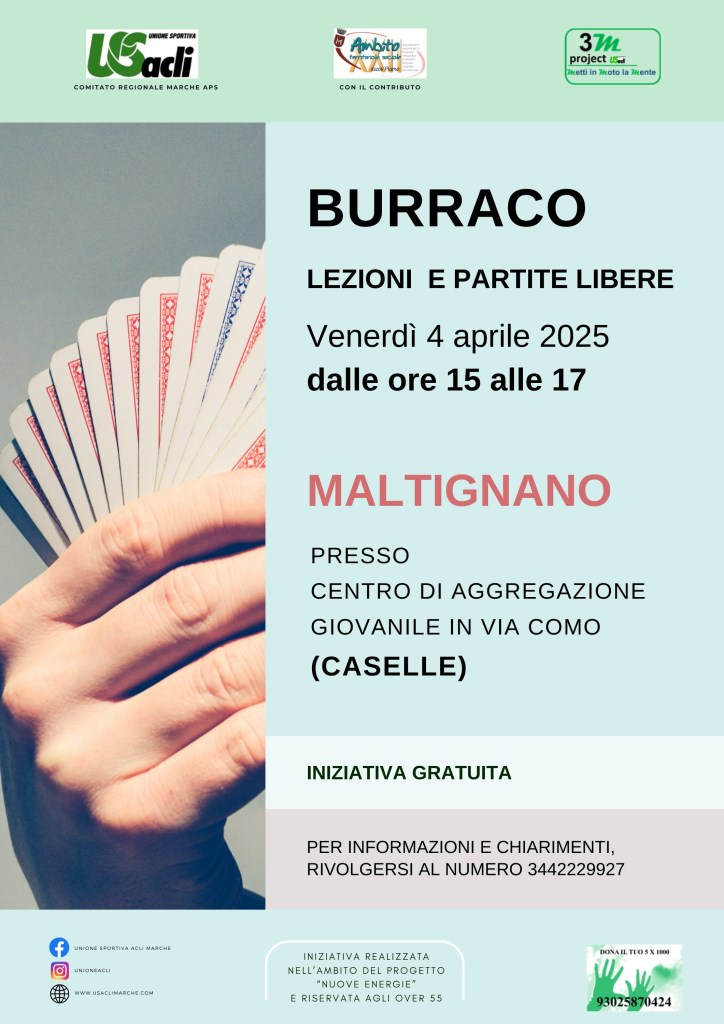 Secondo appuntamento, venerdì 4 Aprile, con le lezioni e le partite libere di burraco del progetto “Nuove energie” coordinato da Unione Sportiva Acli Marche Aps.