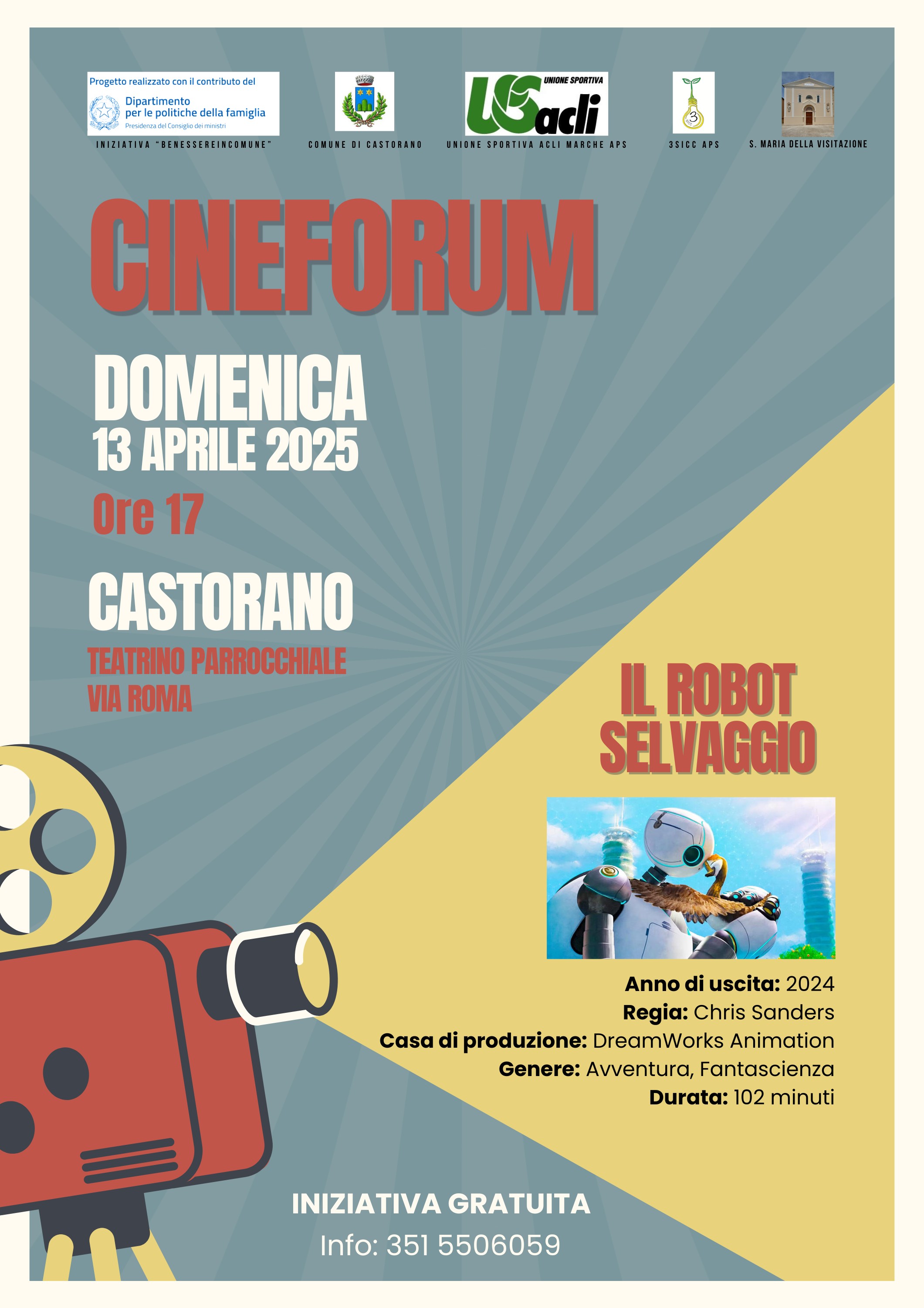 CASTORANO – Domenica 13 aprile alle ore 17.00, presso il Teatrino Parrocchiale di Castorano sito in via Roma, si terrà l’ultimo appuntamento dedicato al progetto di Cineforum comunale con la proiezione de “Il robot selvaggio”, diretto da Chris Sanders e candidato al Premio Oscar 2025 come miglior film di animazione.