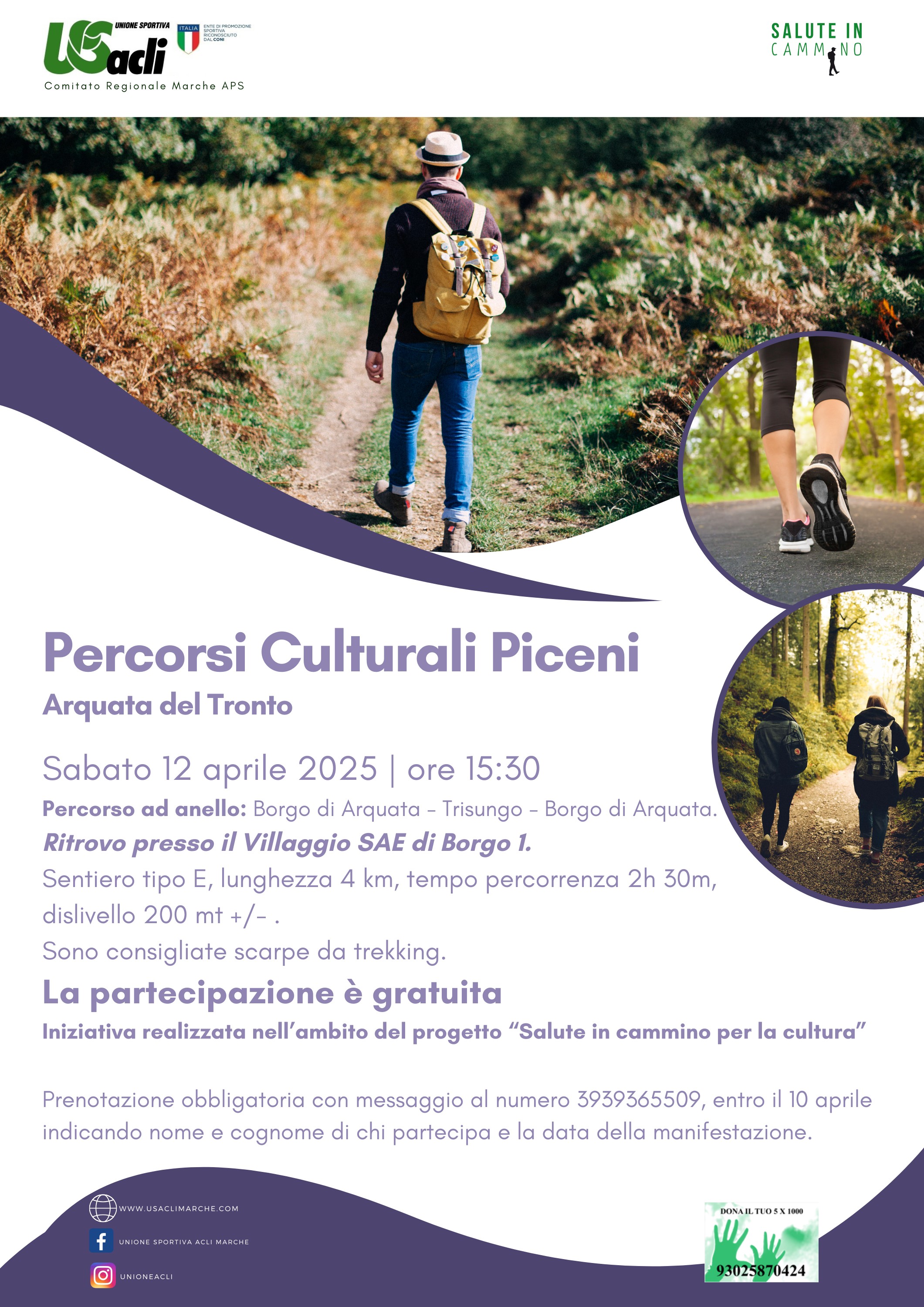 Sabato 12 Aprile torna l’appuntamento col progetto “Salute in cammino per la cultura” con una camminata che si svolgerà nel territorio del Comune di Arquata del Tronto, organizzata da Unione Sportiva Acli Marche Aps.