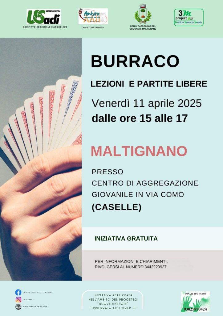 Terzo appuntamento, venerdì 11 Aprile, con lezioni e partite libere di burraco del progetto “Nuove energie” coordinato da Unione Sportiva Acli Marche Aps.