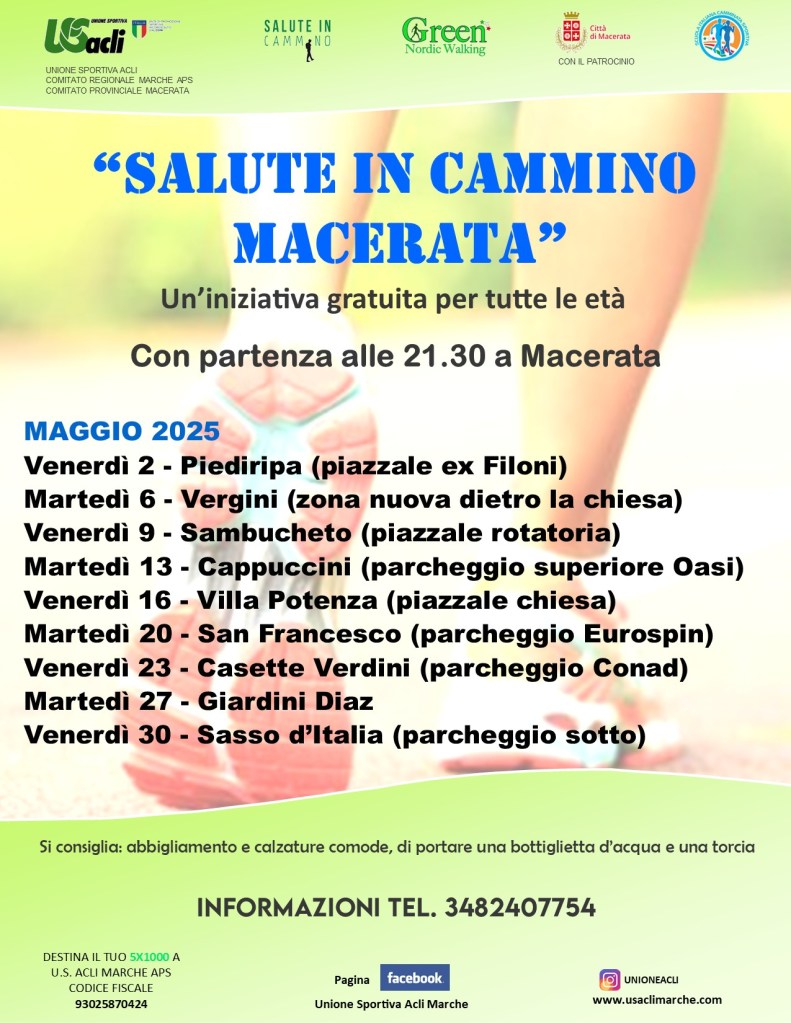 Sono entrate nel vivo le attività del progetto “Salute in cammino” che prevede la realizzazione di nove appuntamenti nel mese di Maggio nel territorio dei comuni di Macerata, Pollenza e Montecassiano.