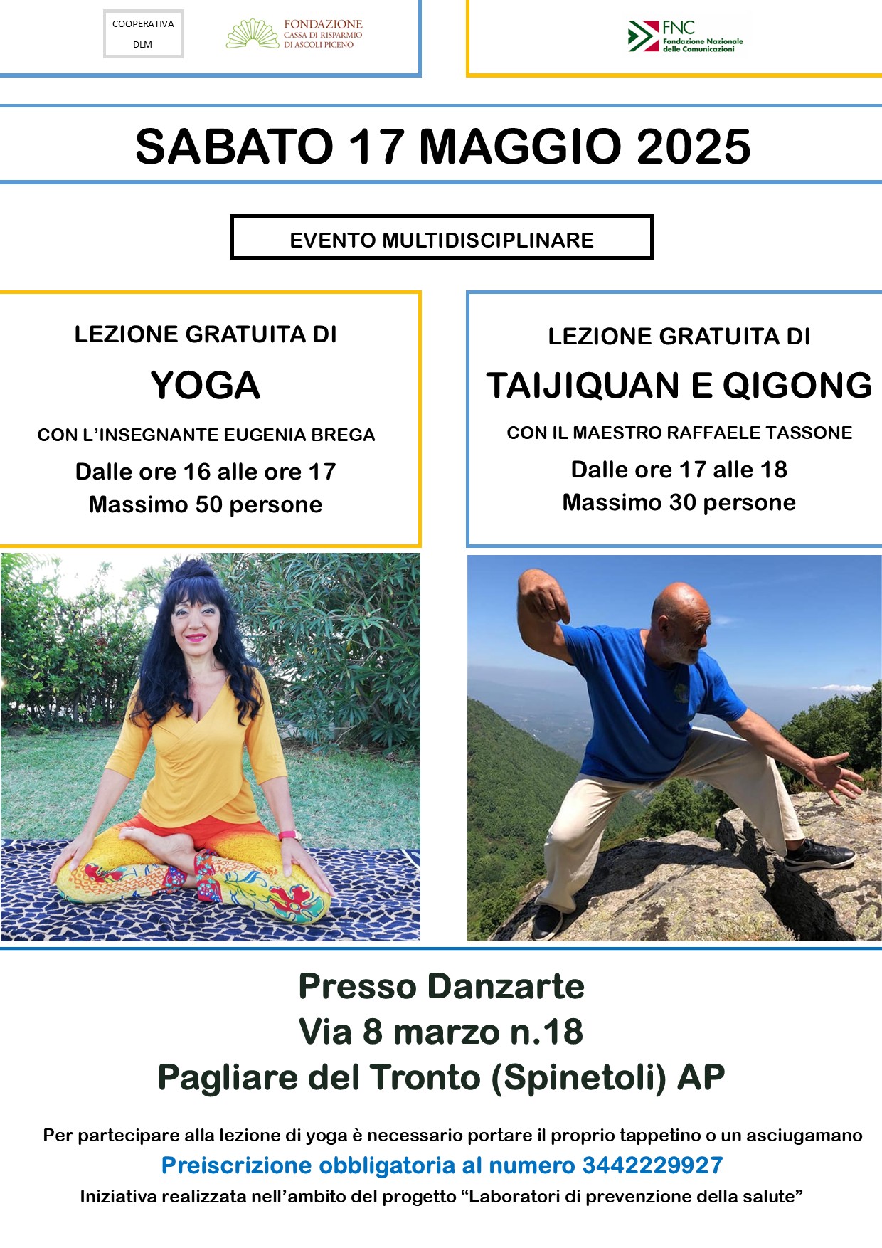 Sabato 17 maggio, dalle ore 16 alle ore 18, si svolgerà un evento multidisciplinare di yoga e taijiquan/qigong riservato a persona di ogni età.