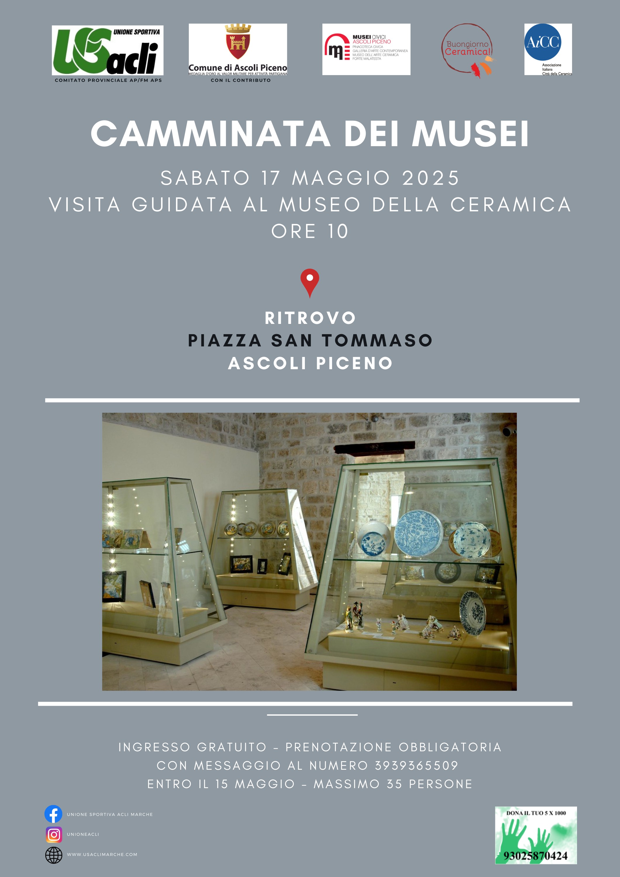Sabato 17 Maggio è in programma ad Ascoli Piceno un nuovo evento gratuito del progetto “Camminata dei musei” promosso da Unione Sportiva Acli provinciale APS, sostenuto dal Comune di Ascoli Piceno e realizzato in collaborazione con Ascoli Musei.