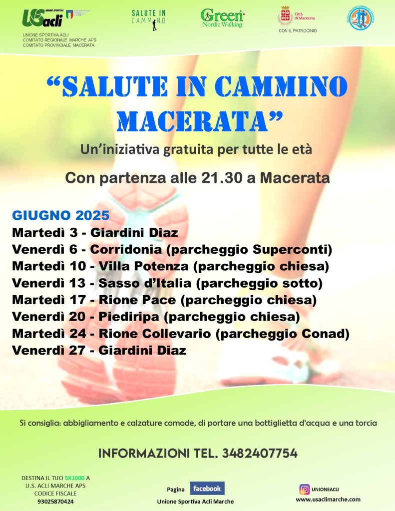 Stanno proseguendo le attività del progetto “Salute in cammino”, che prevede la realizzazione di otto appuntamenti nel mese di Giugno nel territorio dei comuni di Macerata e Corridonia.