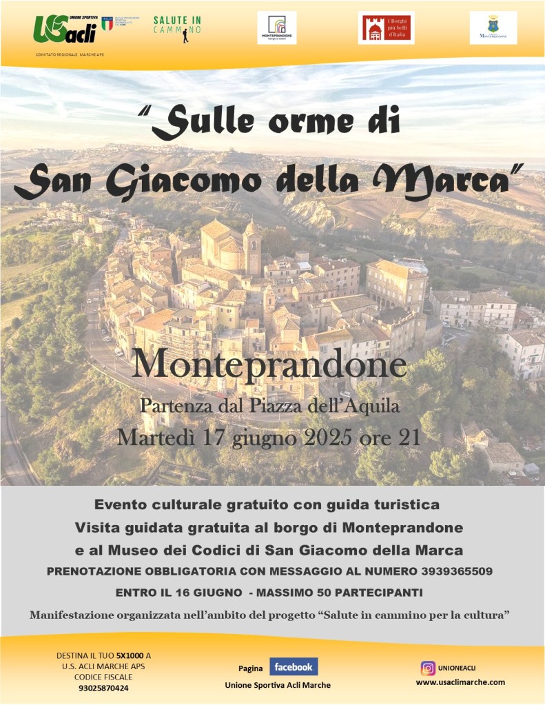 Primo appuntamento, martedì 17 giugno a Monteprandone, con il progetto “Salute in cammino per la cultura” e con l’iniziativa “Sulle orme di San Giacomo della Marca”.