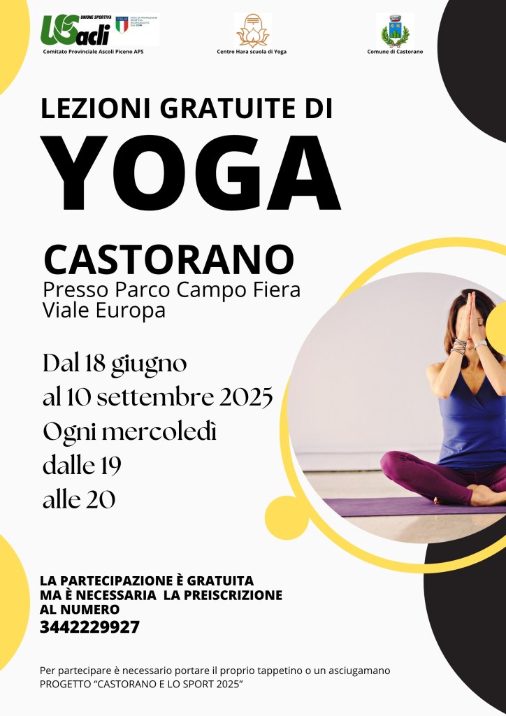 Nell’ambito del progetto “Castorano e lo sport 2025” dal 18 giugno si svolgeranno lezioni gratuite di yoga presso Il Parco Campo Fiera in Viale Europa a Castorano.