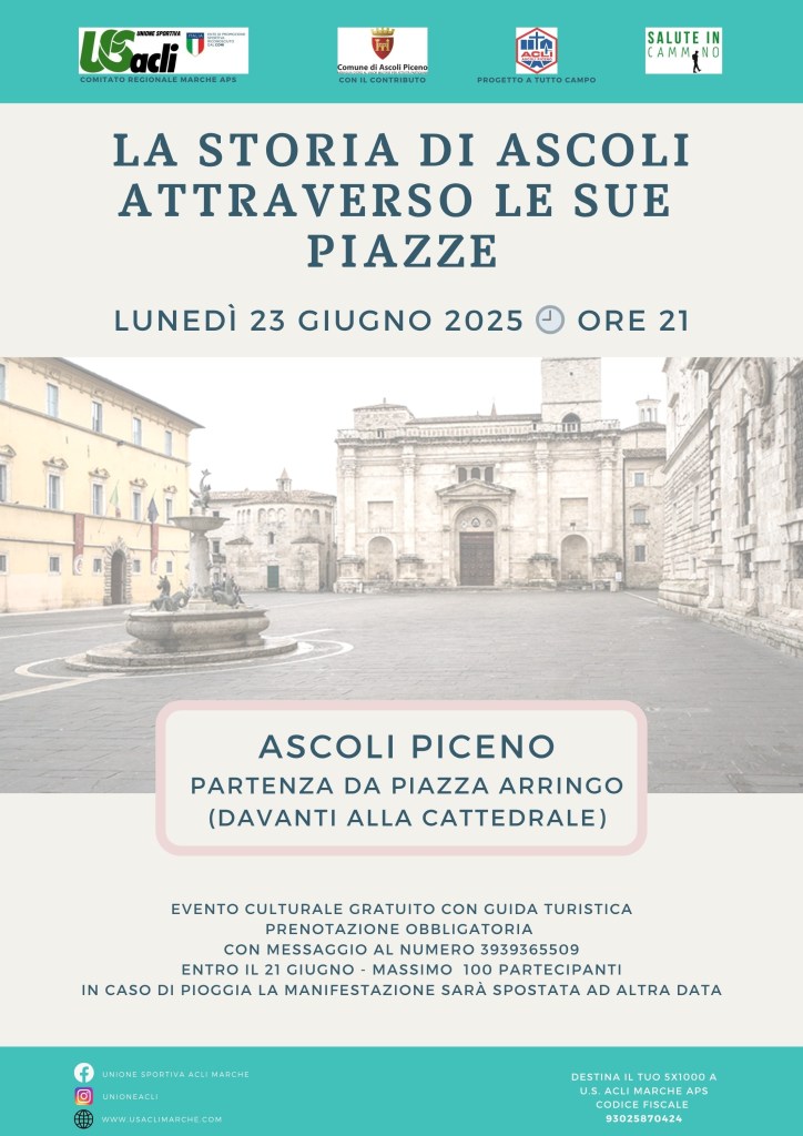 ASCOLI – Lunedì 23 giugno secondo appuntamento con le iniziative del progetto “Salute in cammino per la cultura” curato da Unione Sportiva Acli Marche.