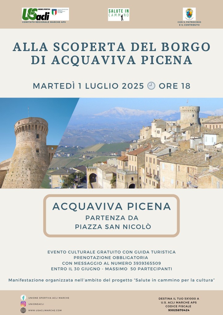 Martedì 1 luglio, ad Acquaviva Picena, è in programma “Salute in cammino per la cultura”, con un itinerario culturale dedicato alla scoperta di uno degli splendidi borghi del Piceno.