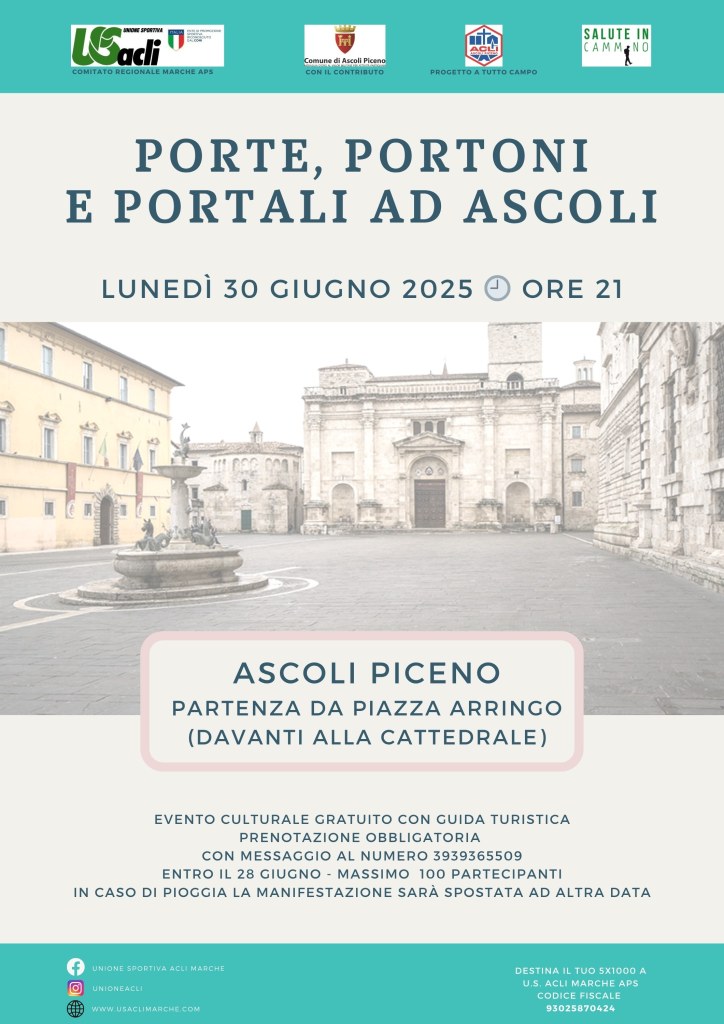 ASCOLI – Lunedì 30 giugno terzo appuntamento con le iniziative del progetto “Salute in cammino per la cultura” curato da Unione Sportiva Acli Marche.