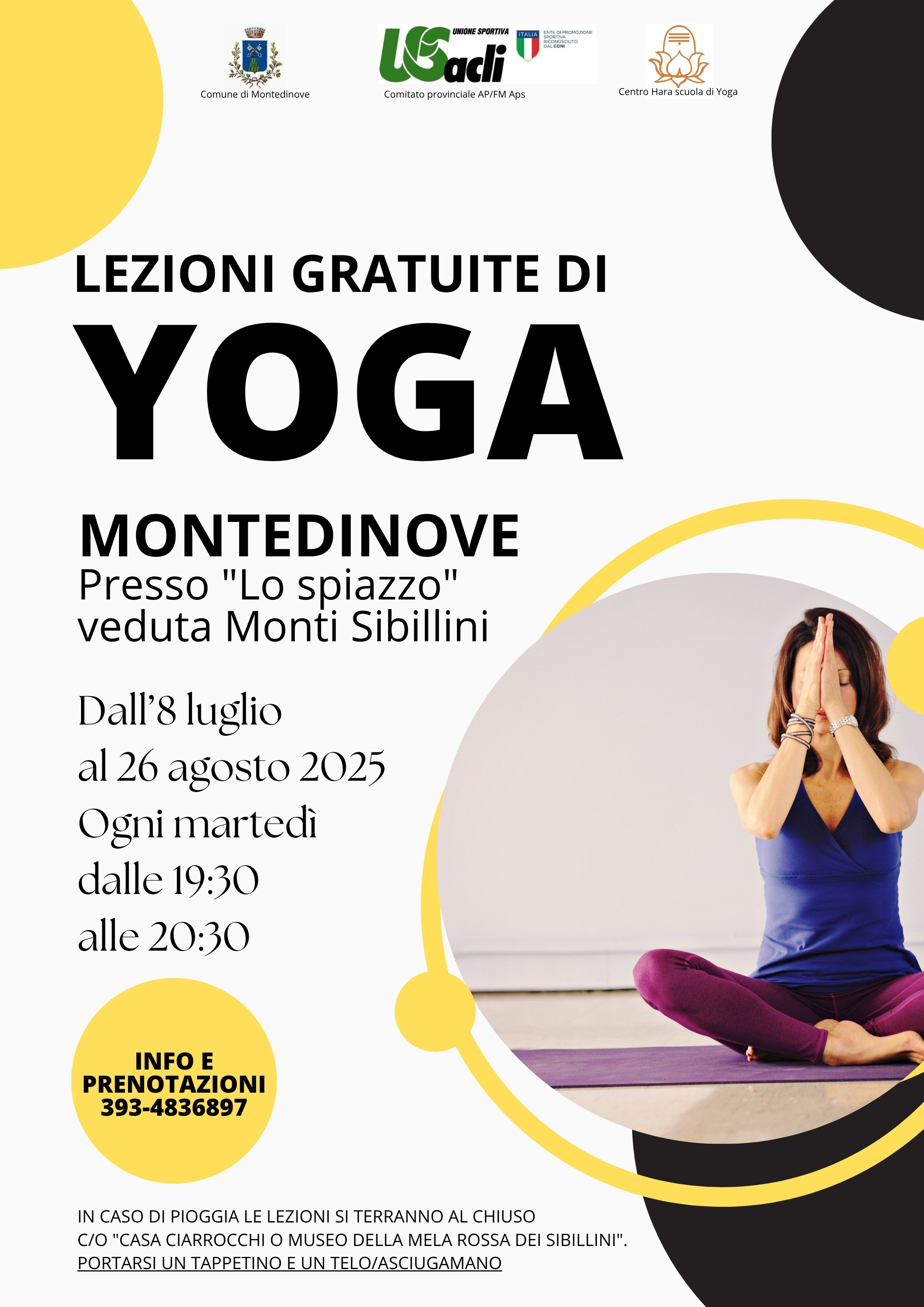 Dall’8 luglio al 26 agosto, a Montedinove, si svolgerà un ciclo di lezioni gratuite di yoga tenuto dagli insegnanti del Centro Hara Scuola di Yoga.