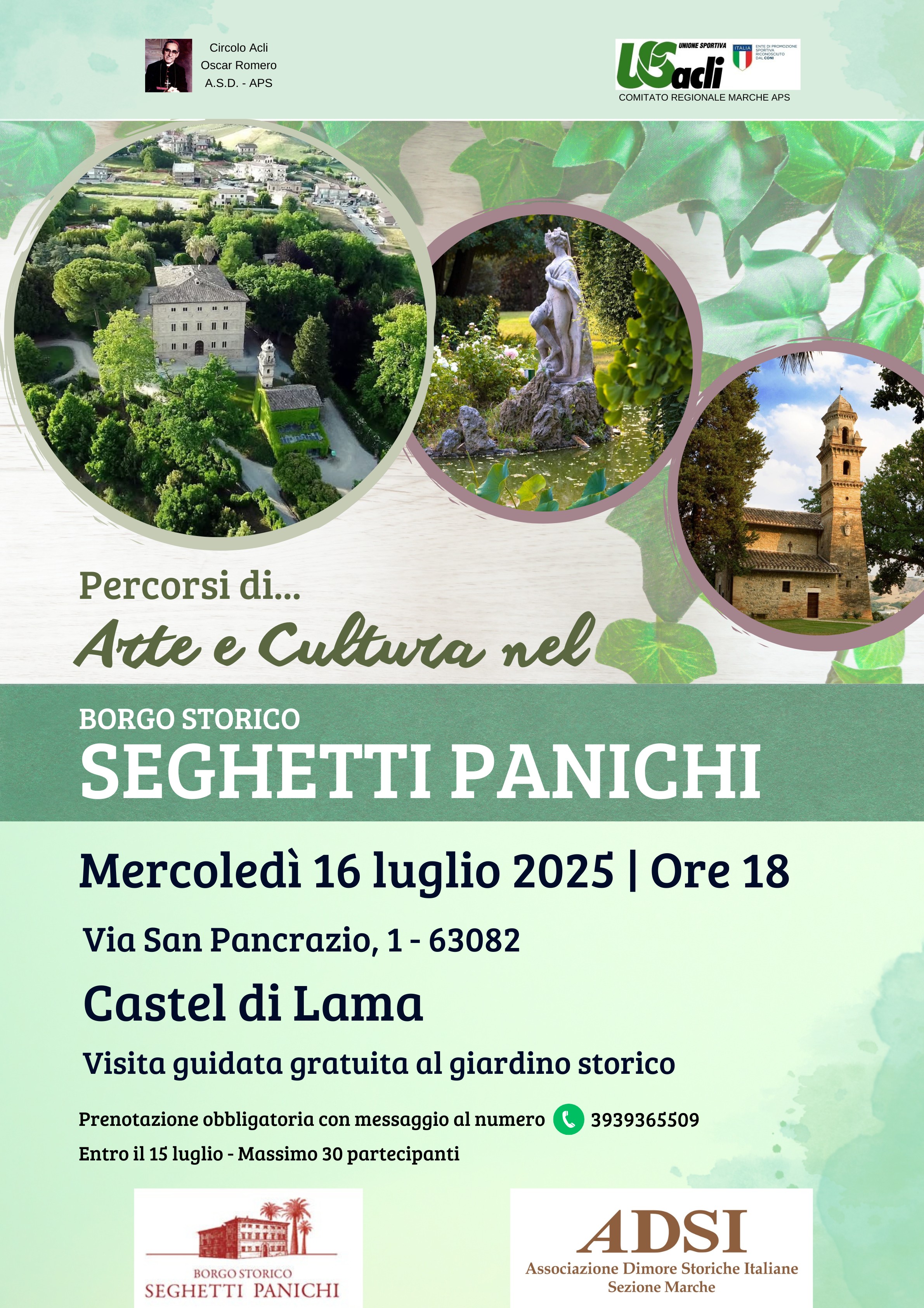Castel di Lama – Mercoledì 16 luglio è in programma l’iniziativa “Percorsi di arte e cultura nel Borgo Storico Seghetti Panichi”.