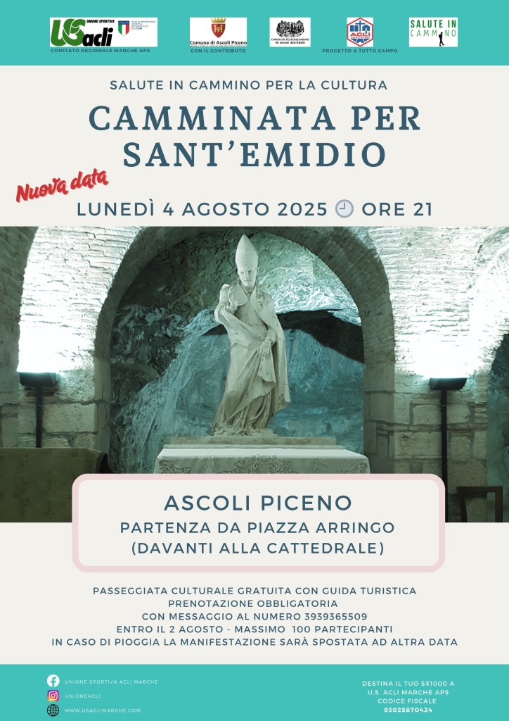 ASCOLI – Lunedì 4 agosto è in programma il settimo appuntamento con le iniziative del progetto “Salute in cammino per la cultura”, curato da Unione Sportiva Acli Marche Aps.
