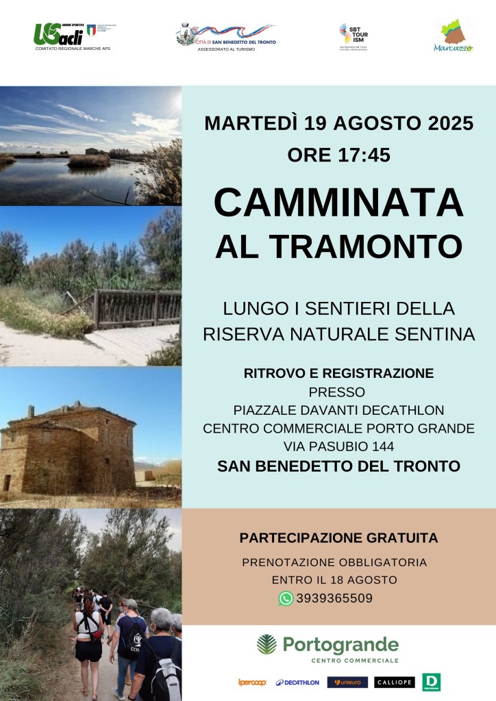 SAN BENEDETTO DEL TRONTO – Il 19 agosto torna la “Camminata al tramonto alla Sentina”, iniziativa che si svolgerà a partire dalle ore 17,45.