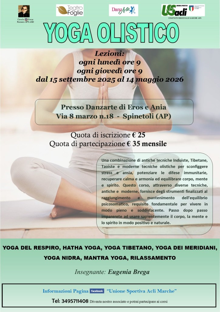 SPINETOLI – Dopo la pausa estiva, riprenderà lunedì 15 settembre il corso di yoga olistico a Pagliare del Tronto tenuto dall’insegnante Eugenia Brega.