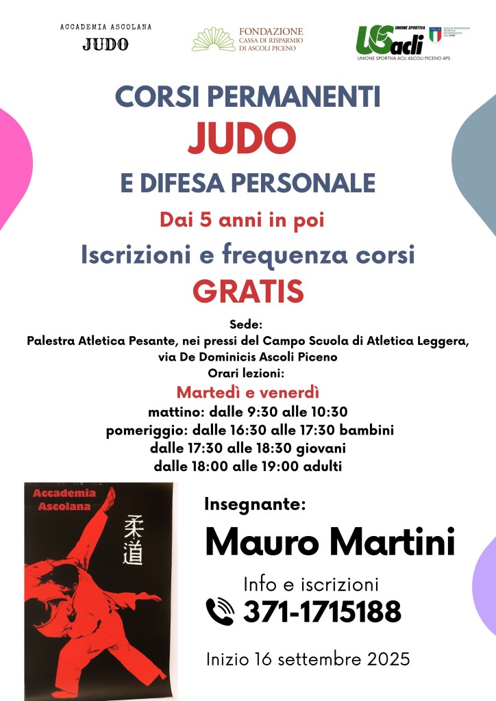L’iniziativa è promossa da Accademia ascolana judo difesa personale Asd, affiliata U.S. Acli, con il contributo della Fondazione Cassa Di Risparmio di Ascoli Piceno ed è aperta a persone di ogni età (basta aver compiuti 5 anni).