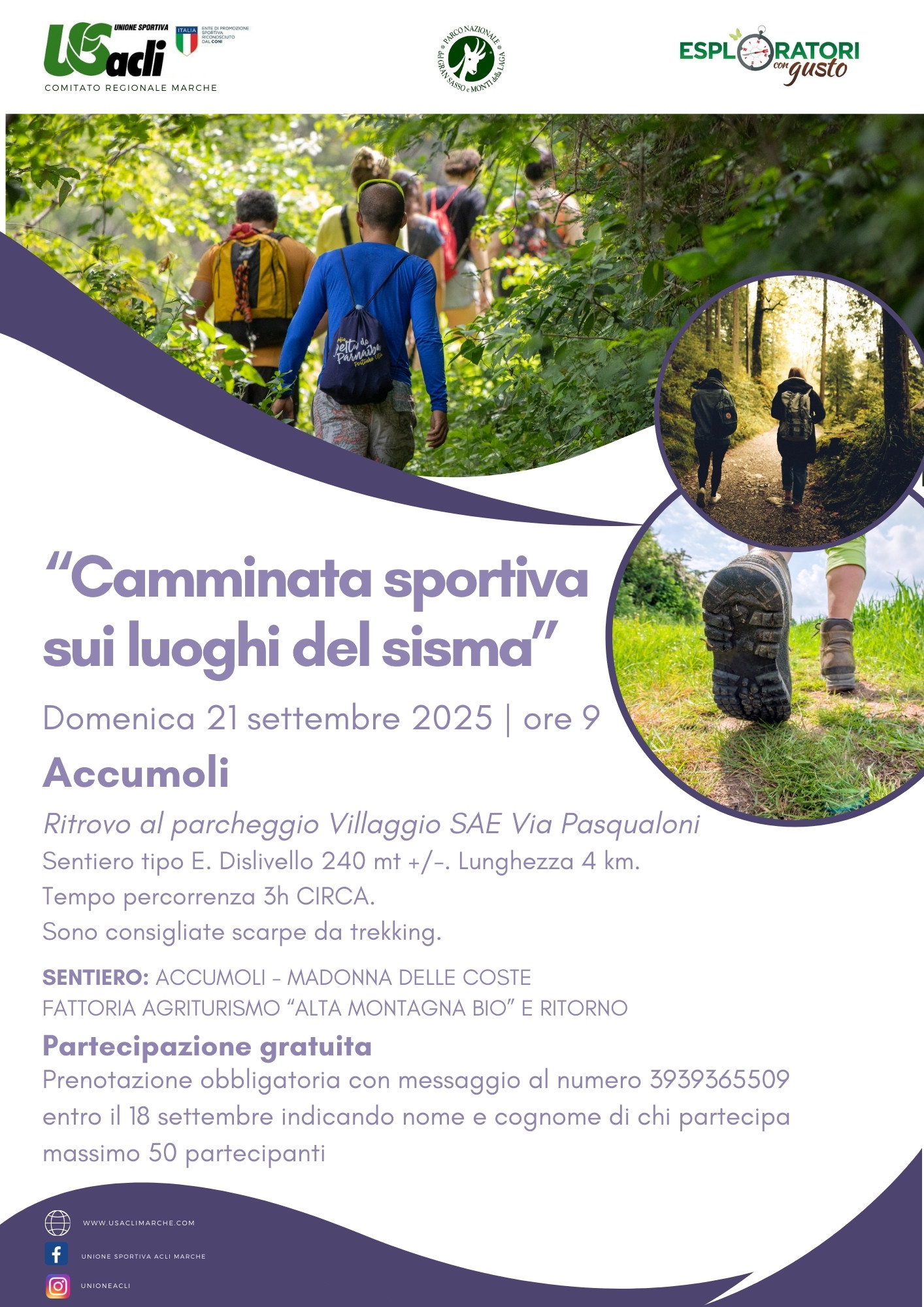 Domenica 21 settembre si svolgerà una camminata sportiva lungo l’anello di Accumoli, un’occasione per immergersi nella bellezza naturale e culturale di uno dei territori più suggestivi del cratere sismico del 2016/2017. L’iniziativa è parte del progetto promosso da Unione Sportiva Acli Marche, volto a valorizzare queste zone attraverso attività che ne esaltano il potenziale turistico e la ricchezza storica, ambientale, enogastronomica e naturalistica.