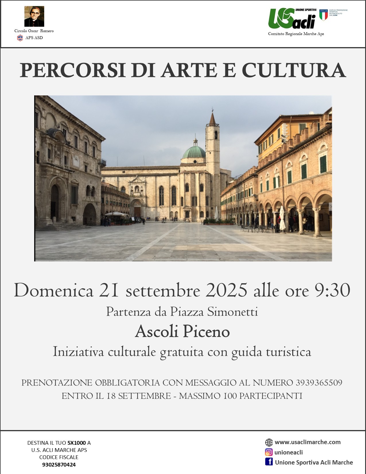 “Percorsi di arte e cultura” è promossa dal Circolo Acli Oscar Romero ASD APS e da U.S. Acli Marche APS. La partecipazione è gratuita, ma limitata a un massimo di 100 persone. Per iscriversi è necessario inviare un messaggio al numero 3939365509, indicando nome, cognome, data e luogo dell’evento.