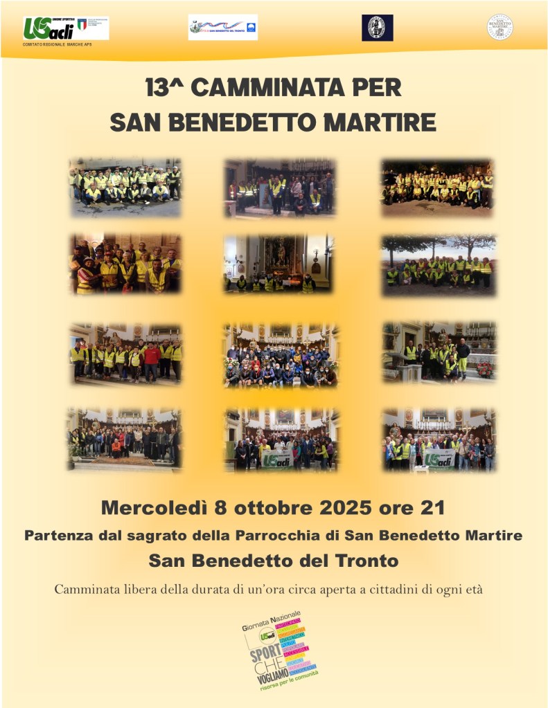 Mercoledì 8 ottobre, in occasione delle festività patronali, si terrà la tredicesima edizione della “Camminata per San Benedetto Martire”, un appuntamento ormai tradizionale per la comunità di San Benedetto del Tronto.