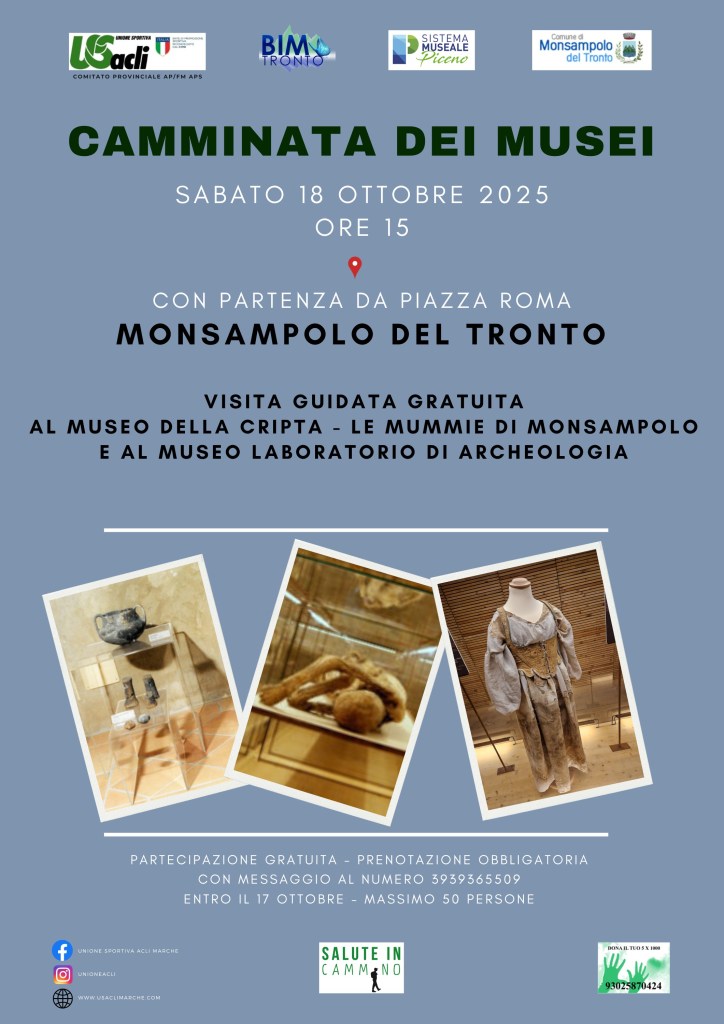 Sabato 18 ottobre, dalle 15 alle 17:30 circa, a Monsampolo si svolgerà un nuovo appuntamento del progetto “Camminata dei musei”. Si tratta di un’iniziativa organizzata dalla U.S. Acli provinciale di Ascoli Piceno/Fermo, con il contributo del Bim Tronto e la collaborazione del Sistema Museale Piceno e del Comune di Monsampolo del Tronto. L’iniziativa “Camminata dei musei” è giunta all’undicesima edizione ed è di carattere interregionale, con una lunga serie di viste a musei delle province di Macerata, Ascoli, Fermo e Teramo visitati a partire dal 2015, grazie a 148 eventi che hanno registrato oltre 6.100 presenze. La manifestazione del 18 ottobre prenderà il via alle ore 15 in Piazza Roma, nel borgo di Monsampolo. A seguire, è prevista una visita guidata gratuita al Museo della Cripta – Le mummie di Monsampolo e al Museo Laboratorio di Archeologia. La partecipazione all’evento è gratuita, fino a un massimo di 50 persone, ma è necessario prenotare entro il 17 ottobre, inviando un messaggio al numero 3939365509, indicando nome e cognome dei partecipanti e la data della manifestazione. Per conoscere le date dei prossimi appuntamenti del progetto “Camminata dei musei”, è possibile consultare la pagina Facebook Unione Sportiva Acli Marche, il sito http://www.cooperativemarche.it