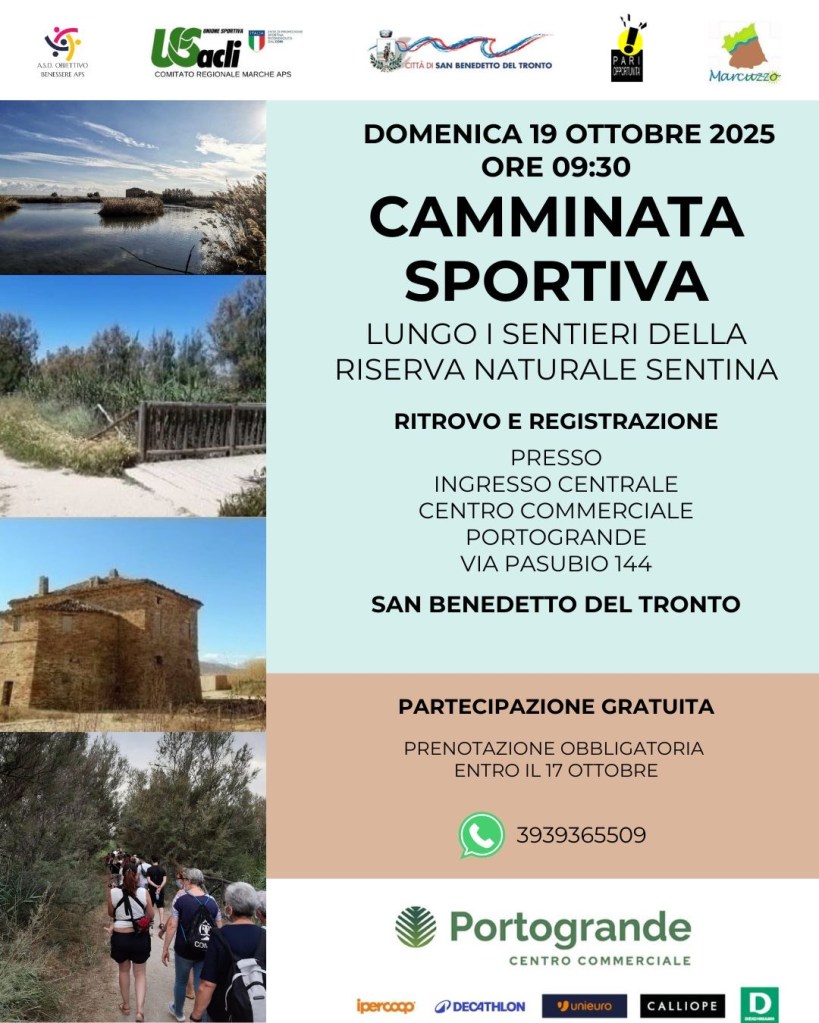 Domenica 19 ottobre 2025, dalle 9:30 alle 12:00 circa, si svolgerà una camminata sportiva lungo i sentieri della Riserva naturale della Sentina. Dopo il grande successo delle edizioni estive, che hanno coinvolto centinaia di partecipanti, torna l’appuntamento con questa iniziativa dedicata alla scoperta del territorio, con l’opportunità di ammirare e conoscere meglio la flora e la fauna locali. L’evento, organizzato da ASD APS Obiettivo Benessere affiliata U.S. Acli Marche APS, sarà condotto da una guida ambientale escursionistica abilitata e si inserisce nel programma del “Fine settimana della salute”, grazie al contributo e al patrocinio della Commissione per le pari opportunità tra uomo e donna della Regione Marche e dell’Assessorato alle pari opportunità del Comune di San Benedetto del Tronto, con la collaborazione dell’Associazione Il Marcuzzo e del Centro Commerciale Portogrande. La partecipazione è gratuita e il ritrovo è previsto alle 9,30 davanti all’ingresso principale del Centro Commerciale Portogrande, in via Pasubio 144 a Porto d’Ascoli (San Benedetto del Tronto), dove si svolgeranno le operazioni di registrazione. Seguirà una visita guidata all’interno della riserva, che si distingue per la presenza di ambienti naturali unici come cordoni sabbiosi, zone umide retrodunali e praterie salmastre, habitat di una flora rara e peculiare, ormai scomparsa in gran parte del litorale adriatico a causa dell’antropizzazione. La prenotazione è obbligatoria e va effettuata entro il 17 ottobre inviando un messaggio al numero 3939365509, indicando nome, cognome e data della camminata.
