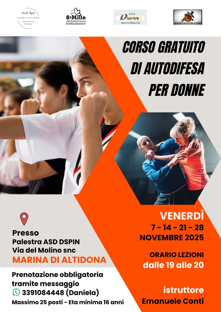 Dal 7 al 28 novembre, ogni venerdì dalle 19 alle 20, si terrà un nuovo corso gratuito di autodifesa per donne presso la palestra ASD Dspin in via del Molino ad Altidona. L’iniziativa è promossa dall’Associazione Giovanile Picena Asd Aps, con il sostegno dell’Unione Induista Italiana – Fondi Otto per Mille e della collaborazione di ASD Dspin e dei tecnici di Ares 2.00 Evolution. Il corso rientra nel progetto “Panchine rosse tutto l’anno”, nato per promuovere informazione, educazione e prevenzione sul tema della violenza contro le donne. L’obiettivo è non solo quello di aumentare la sicurezza personale delle partecipanti, ma anche di fornire competenze tecniche e strumenti per affrontare con equilibrio eventuali situazioni di pericolo. Il corso è riservato a donne dai 16 anni in su, fino a un massimo di 25 partecipanti. Per iscriversi è necessario inviare un messaggio WhatsApp al numero 3391084448, indicando i propri dati anagrafici.