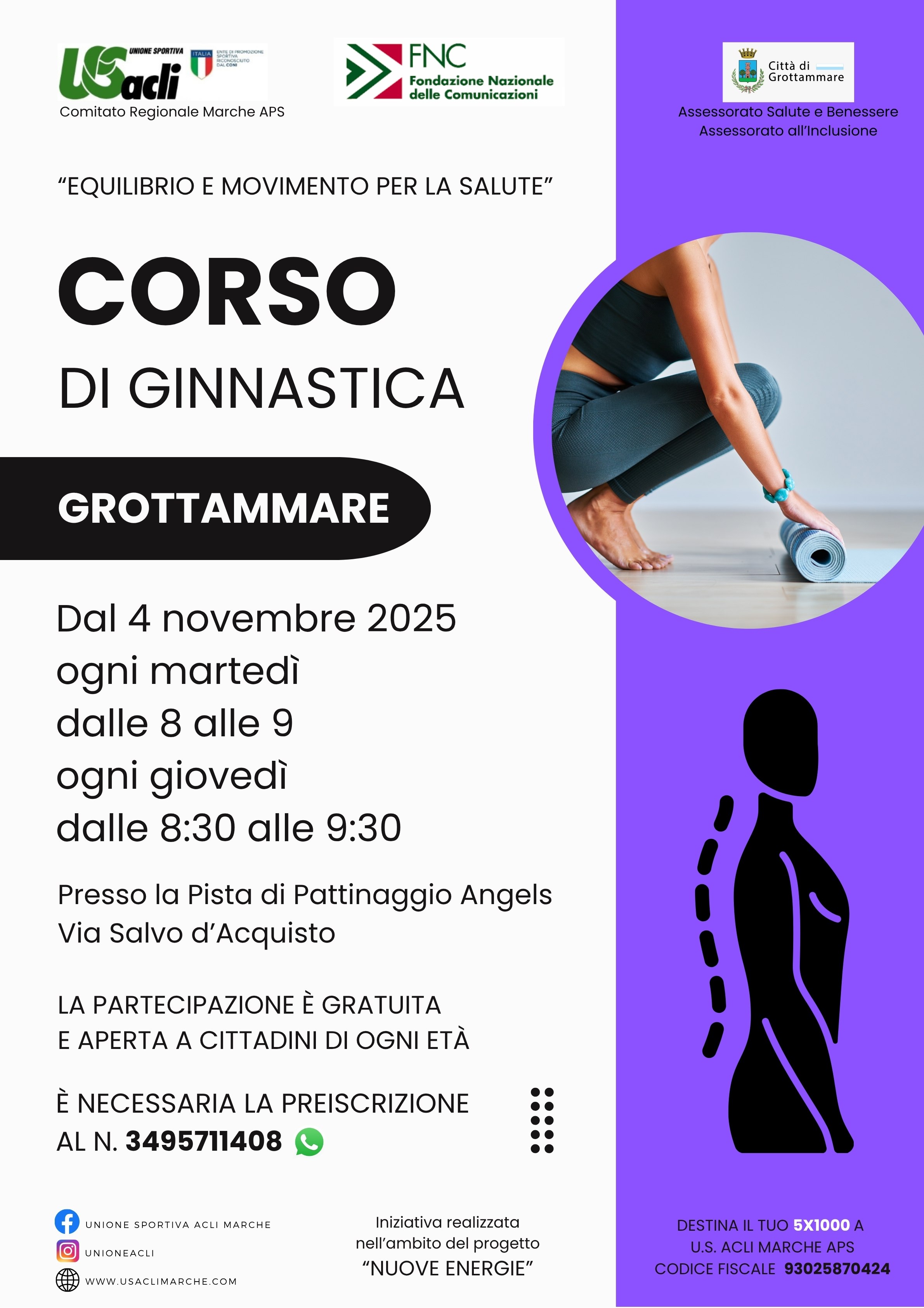 Il progetto consiste in un corso gratuito di ginnastica organizzato dall’Unione Sportiva Acli Marche Aps, col sostegno della Fondazione Nazionale delle Comunicazioni (all’interno del progetto “Il valore sociale dello sport”) e del Comune di Grottammare, assessorati alla salute e al benessere e inclusione.