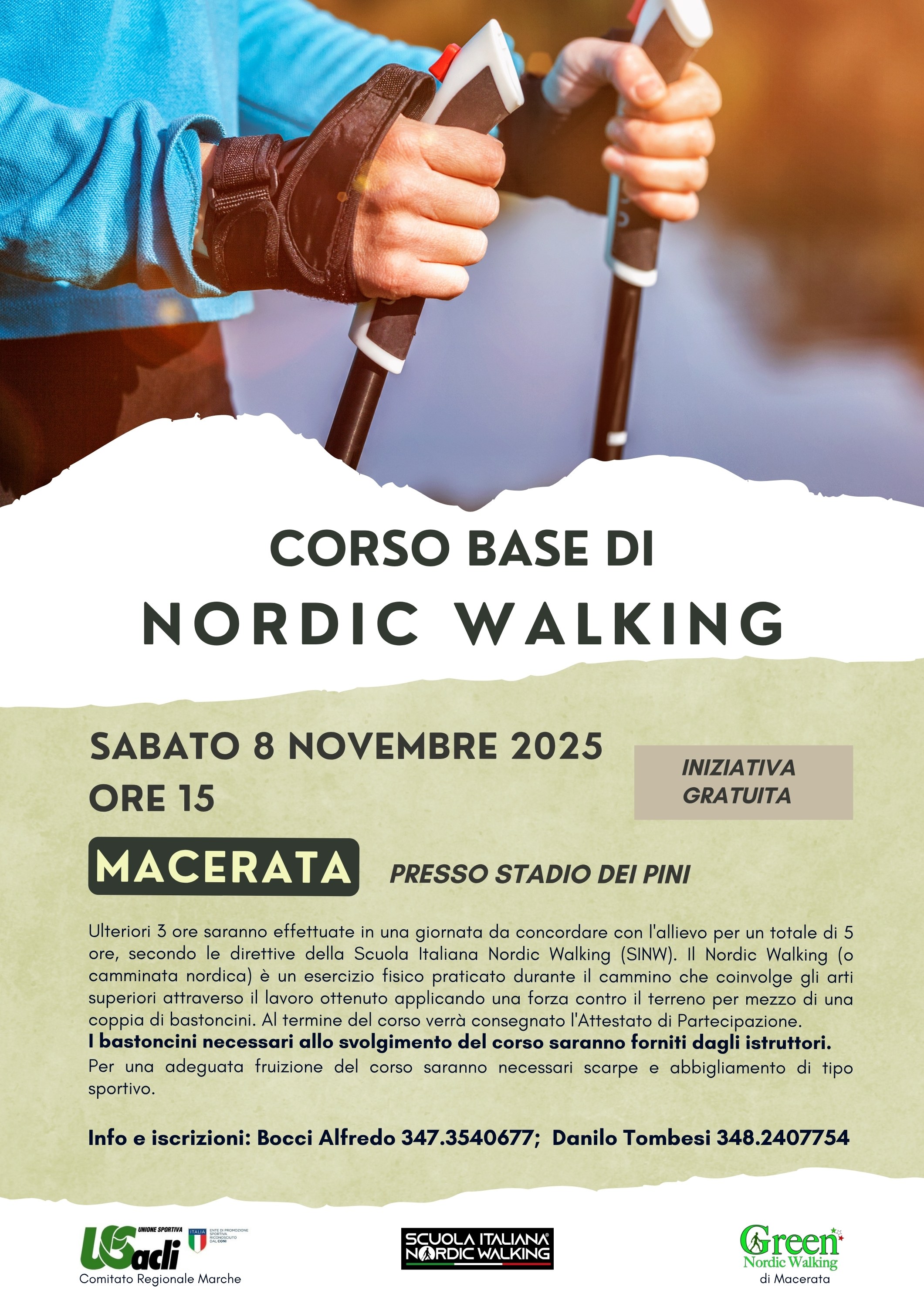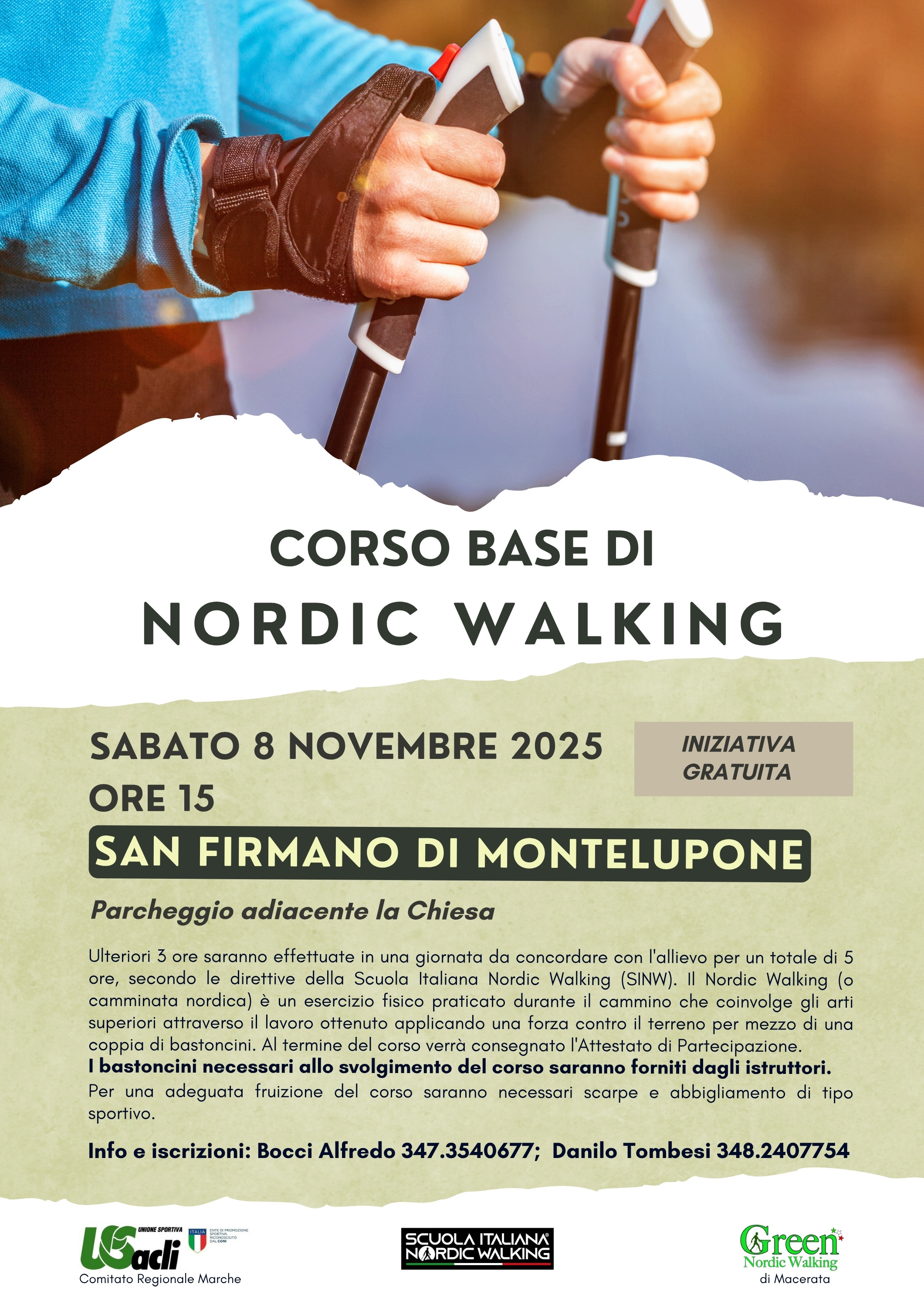Sabato 8 novembre a Macerata e a San Firmano di Montelupone si svolgeranno due corsi base gratuiti di Nordic Walking. Le due attività sono organizzate da U.S. Acli Marche APS, Green Nordic Walking di Macerata e Scuola Italiana di Nordic Walking, nell’ambito di un progetto che mira a coinvolgere la comunità nella promozione di corretti stili di vita e nell’incremento dell’attività fisica. Il corso di Macerata si terrà presso lo Stadio dei Pini a partire dalle ore 15, mentre quello di San Firmano di Montelupone avrà luogo nel parcheggio adiacente la chiesa, sempre dalle ore 15. Per informazioni e iscrizioni è possibile contattare i referenti Alfredo Bocci al numero 3473540677 o Danilo Tombesi al numero 3482407754. I bastoncini saranno messi a disposizione dall’organizzazione e il corso prevede un totale di 5 ore, di cui 2 iniziali e ulteriori 3 da concordare con l’allievo, secondo le direttive della Scuola Italiana di Nordic Walking. Per partecipare è necessario indossare scarpe e abbigliamento sportivo adeguato. Il Nordic Walking è un’attività che allena fino al 90% della muscolatura del corpo e, rispetto a una semplice camminata, consente un maggiore consumo di energia grazie al coinvolgimento delle articolazioni di polso, gomito e spalla e al lavoro di muscoli come dorsali, addominali e lombari.