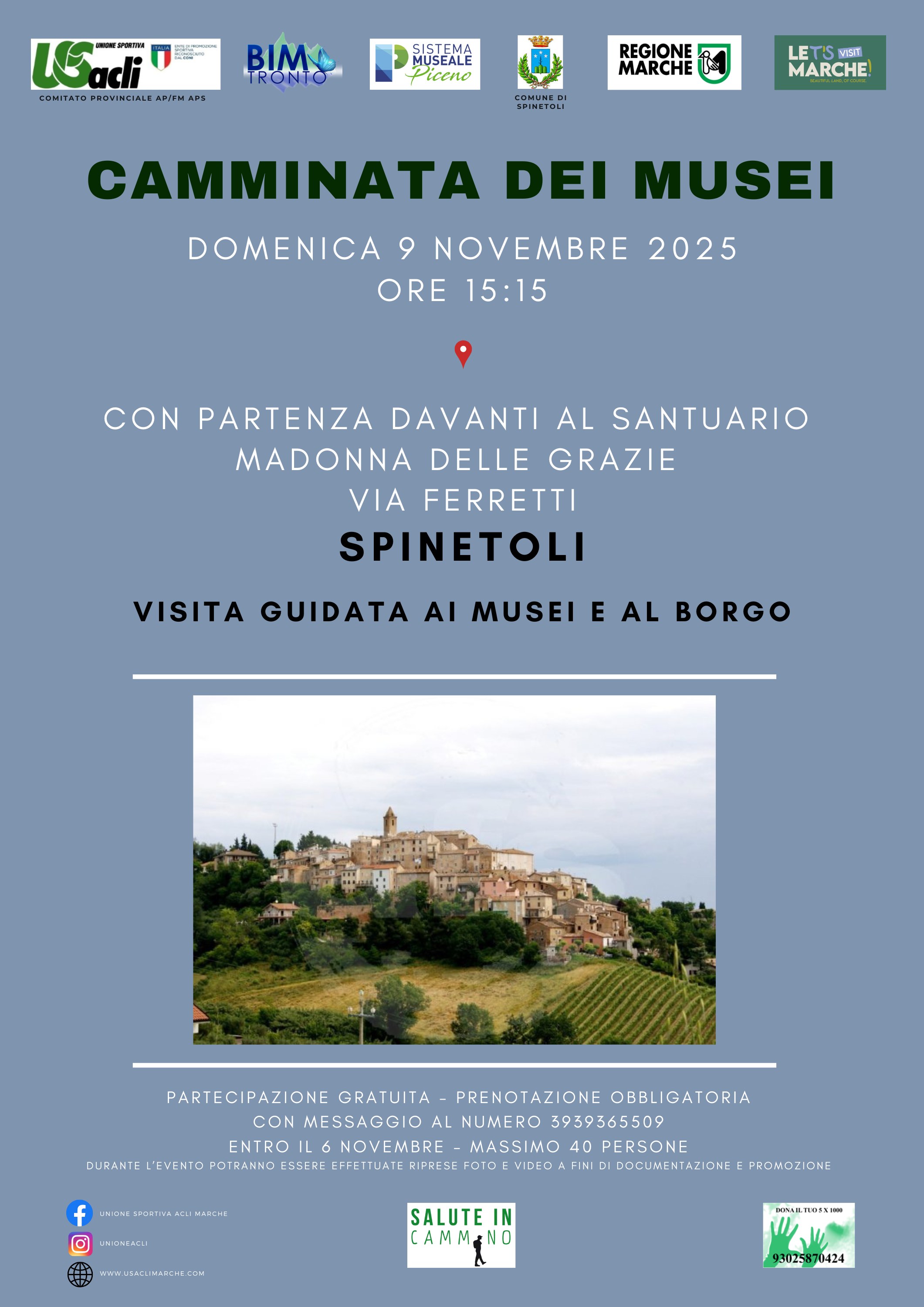 Domenica 9 Novembre, Spinetoli sarà protagonista di un pomeriggio dedicato alla scoperta del patrimonio culturale locale, grazie a una nuova tappa del progetto “Camminata dei musei”. L’iniziativa, che si svolgerà dalle 15,15 alle 18 circa circa, è promossa dalla U.S. Acli provinciale di Ascoli Piceno/Fermo con il sostegno del Bim Tronto e della Regione Marche, in sinergia con il Sistema Museale Piceno e con il patrocinio del Comune di Spinetoli. Il punto di ritrovo è fissato davanti al Santuario Madonna delle Grazie in via Ferretti a Spinetoli. Da lì prenderà il via una passeggiata culturale che condurrà i partecipanti tra le bellezze della città, all’interno dei musei della civiltà contadina e della scultura, del suo borgo antico, accompagnati da una guida esperta. L’esperienza è gratuita e aperta a un massimo di 40 persone; per partecipare è necessario prenotarsi inviando un messaggio al numero 3939365509 con nome, cognome e il luogo di svolgimento della manifestazione. Si consigliano abbigliamento comodo e scarpe da tennis.