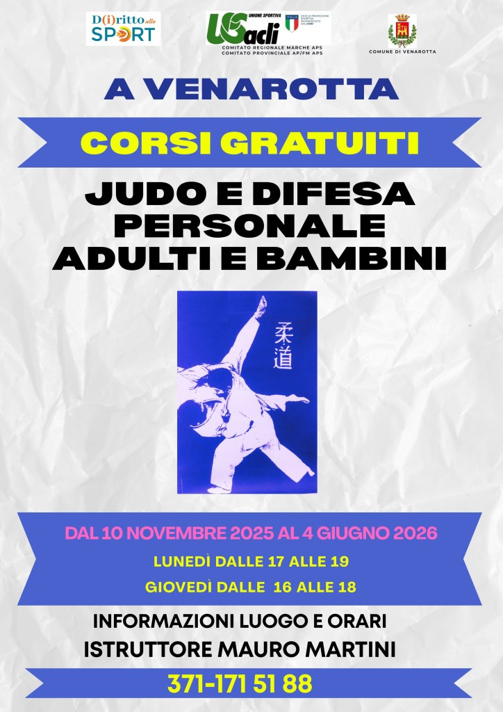A Venarotta, presso la palestra della Scuola Don Milani, si svolgeranno corsi gratuiti di judo e difesa personale riservati a adulti e bambini ogni lunedì (dalle 17 alle 19) e ogni giovedì (dalle 16 alle 18).