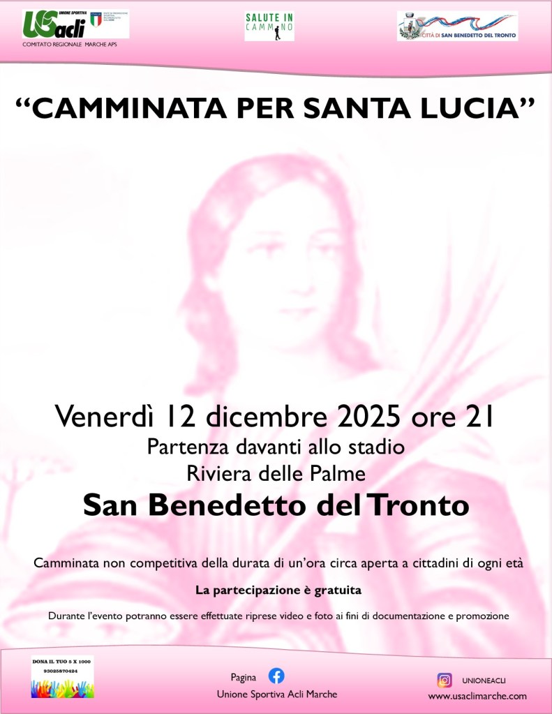 SAN BENEDETTO DEL TRONTO – Appuntamento per venerdì 12 dicembre con l’ormai tradizionale “Camminata per Santa Lucia”, la cui festività è tanto cara ai sambenedettesi.