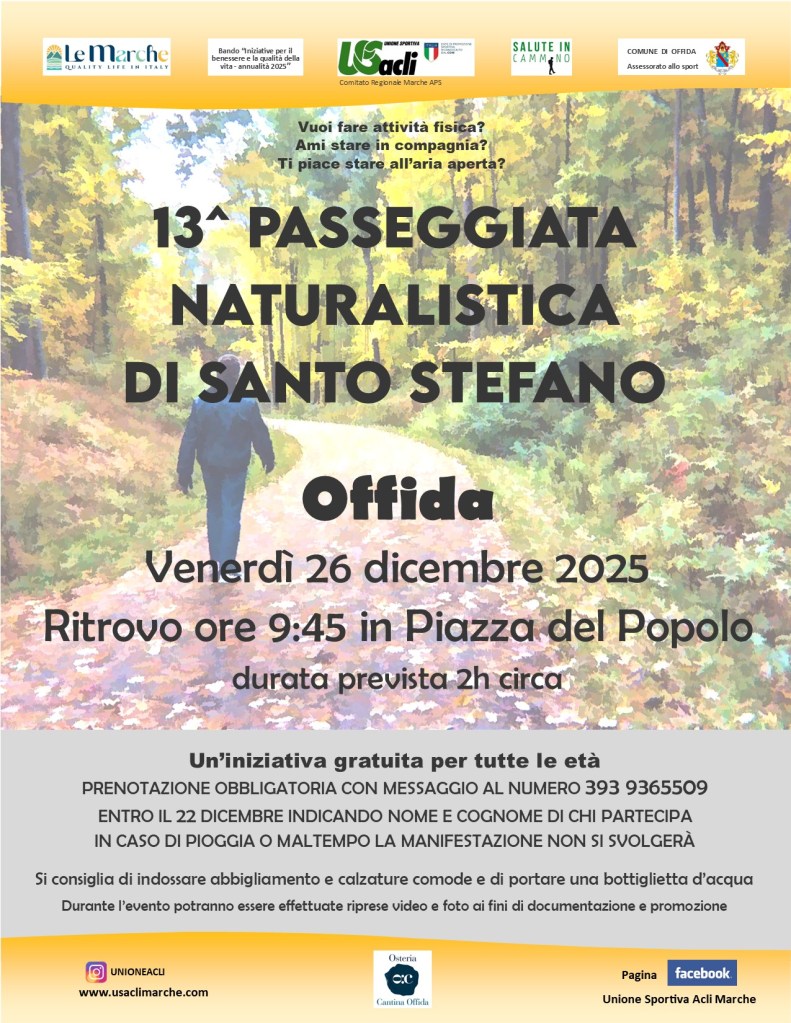 La partecipazione all’iniziativa, organizzata in collaborazione con U.S. Acli Marche APS e col sostegno di Regione Marche e assessorato allo sport del Comune di Offida, in collaborazione con Osteria Cantina Offida, è gratuita ma occorre preiscriversi entro il 22 dicembre con un messaggio al numero 3939365509, indicando la data della manifestazione e nome e cognome di chi partecipa. Stanno proseguendo dunque, nel territorio del Comune di Offida, le attività realizzate nell’ambito del progetto presentato dal Comune di Offida sul bando regionale “Iniziative a carattere territoriale sui tempi del benessere e della qualità della vita”. La manifestazione intende promuovere il movimento e combattere la sedentarietà, oltre che creare un importante momento di aggregazione.