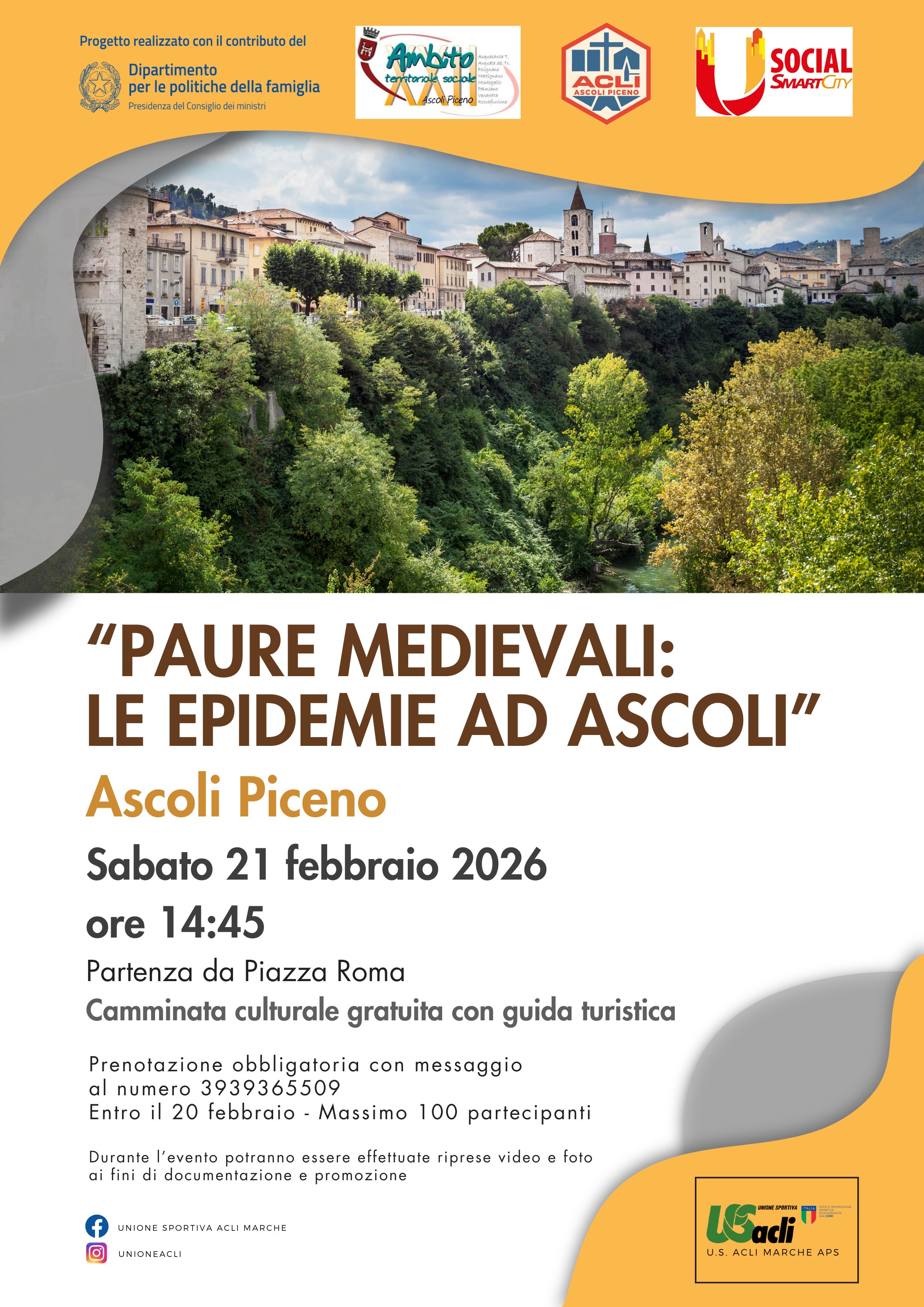 Sabato 21 febbraio, dalle ore 14:45 alle 17,30 circa, si svolgerà ad Ascoli Piceno un evento culturale gratuito promosso da Unione Sportiva Acli Marche Aps denominato “Paure medievali: le epidemie ad Ascoli”.