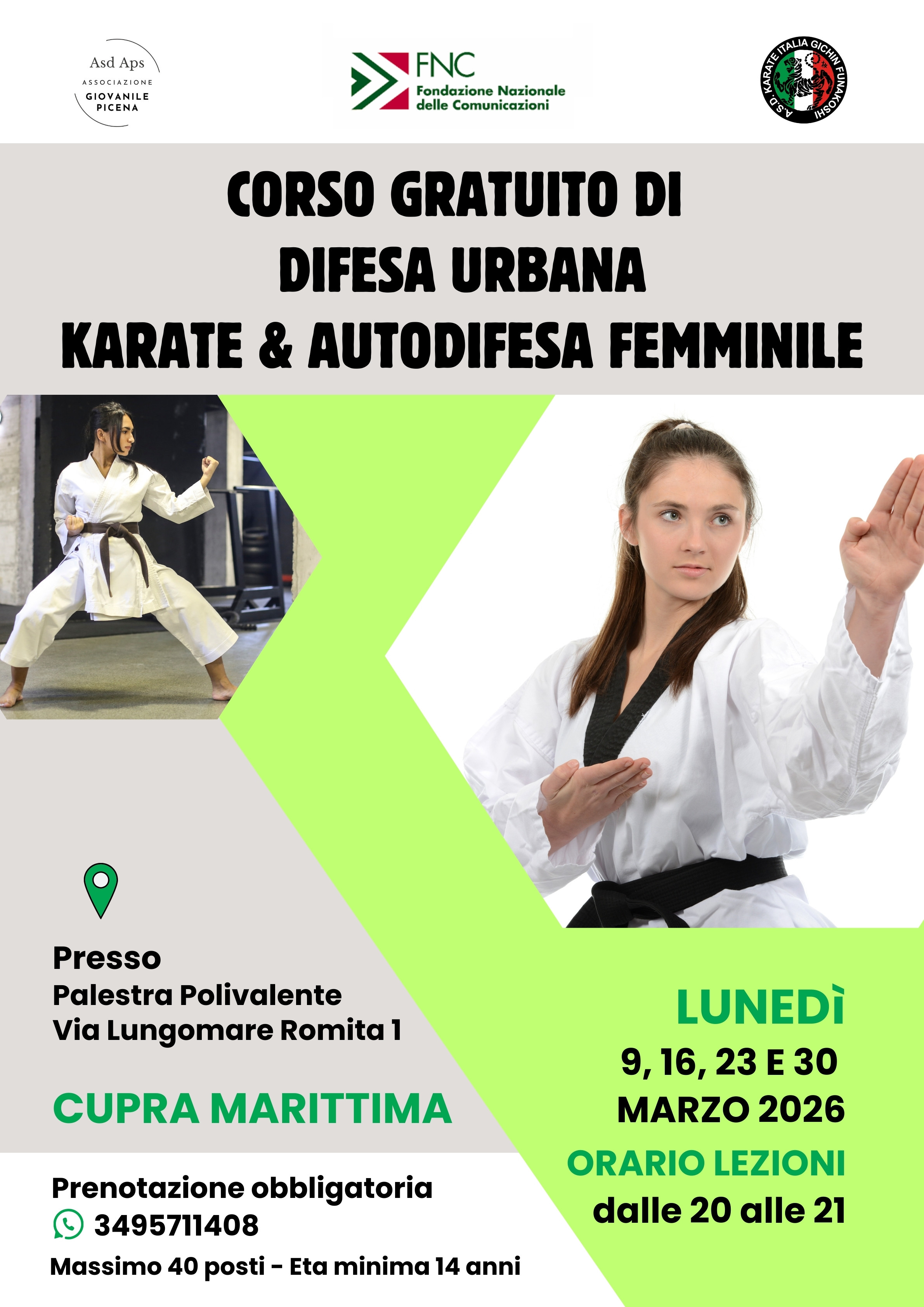 Il corso è promosso dall’Associazione Giovanile Picena ASD APS con il sostegno della Fondazione Nazionale delle Comunicazioni, e si avvale della collaborazione degli istruttori di A.S.D. Karate Gichin Funakoshi.