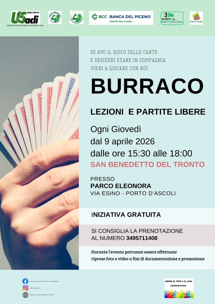Dal 9 aprile, ogni giovedì dalle 15,30 alle 18, sono in programma lezioni e partite libere di burraco. L’appuntamento è presso il Parco Eleonora di Porto d’Ascoli in via Esino a San Benedetto del Tronto. L’iniziativa rientra nell’azione progettuale “Metti in moto la mente” realizzata da U.S. Acli Marche APS col sostegno della Banca del Piceno e la collaborazione dell’Associazione Truentum Aps e dell’Associazione Il Marcuzzo. “Se ami il gioco delle carte e desideri stare in compagnia vieni a giocare con noi”, è questo l’invito dei promotori dell’iniziativa. La partecipazione alle attività è gratuita, per informazioni si può inviare un messaggio al numero 3495711408. Il burraco è un gioco di carte della famiglia della canasta, praticato con due mazzi francesi più jolly. Si gioca generalmente in coppia e richiede di creare combinazioni di carte – scale o gruppi dello stesso valore – fino a formare il “burraco”, una combinazione lunga che permette di chiudere la mano. Pur essendo semplice da apprendere, il burraco combina strategia, memoria, capacità di osservazione e cooperazione tra compagni di squadra. I benefici sono numerosi e coinvolgono persone di ogni età. Per gli anziani, il burraco stimola le funzioni cognitive: attenzione, memoria di lavoro, pianificazione e velocità di ragionamento. È un’attività che contrasta l’isolamento sociale, favorisce la socializzazione e sostiene il benessere emotivo. Per gli adulti, rappresenta un’occasione per allenare la mente in modo piacevole, ridurre lo stress e coltivare relazioni positive. Anche i giovani traggono vantaggio dal gioco: sviluppano capacità logiche, pensiero strategico e gestione delle emozioni, imparando al tempo stesso a collaborare e a rispettare le regole. Il burraco, insomma, è molto più di un passatempo: è un esercizio mentale, sociale e relazionale che unisce generazioni diverse e crea comunità.