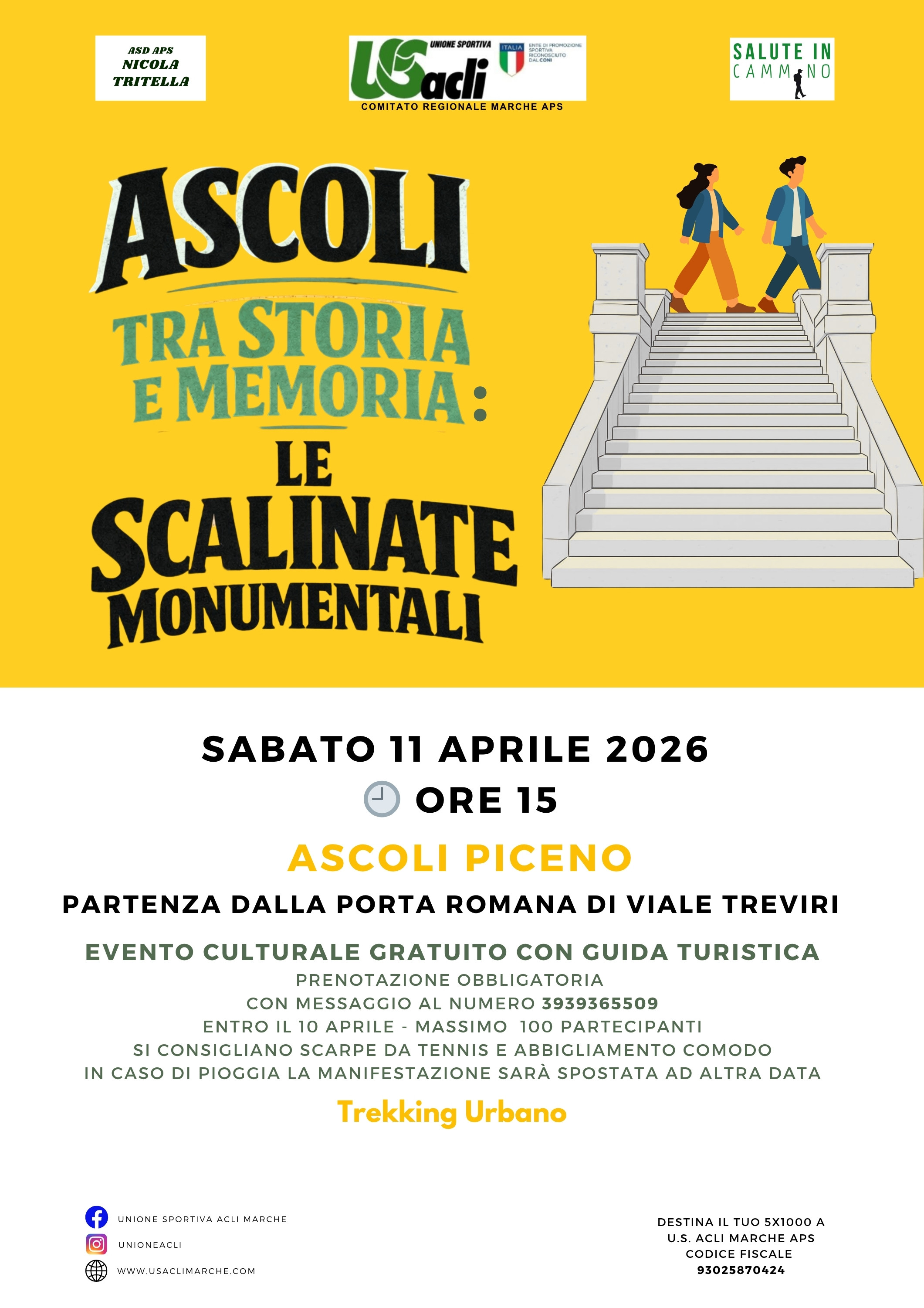 Sabato 11 aprile è in programma un trekking urbano dal titolo “Ascoli tra storia e memoria: le scalinate monumentali”. L’appuntamento è alle ore 15 in viale Treviri, ad Ascoli Piceno, davanti alla Porta Romana. L’iniziativa è gratuita e prevede la presenza di una guida turistica abilitata.