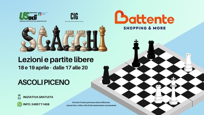 Sabato 18 e domenica 19 aprile, dalle 17 alle 20, si svolgeranno lezioni e partite libere di scacchi aperte a persone di ogni età, presso il Centro commerciale Battente ad Ascoli Piceno.