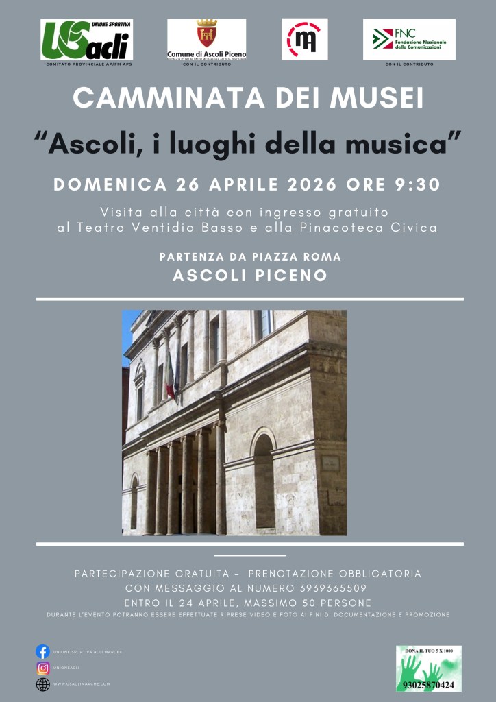 Si tratta di un nuovo evento gratuito promosso da Unione Sportiva Acli provinciale Aps, sostenuto dal Comune di Ascoli Piceno e dalla Fondazione Nazionale delle Comunicazioni, e realizzato in collaborazione con Ascoli Musei.