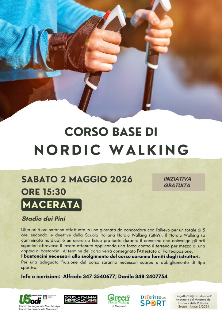 Sabato 2 maggio, a Macerata, si terrà un corso introduttivo gratuito di Nordic Walking. L’appuntamento è promosso da U.S. Acli Marche APS, U.S. Acli provinciale Macerata, Green Nordic Walking di Macerata e dalla Scuola Italiana di Nordic Walking, all’interno del progetto “D(i)ritto allo sport”.